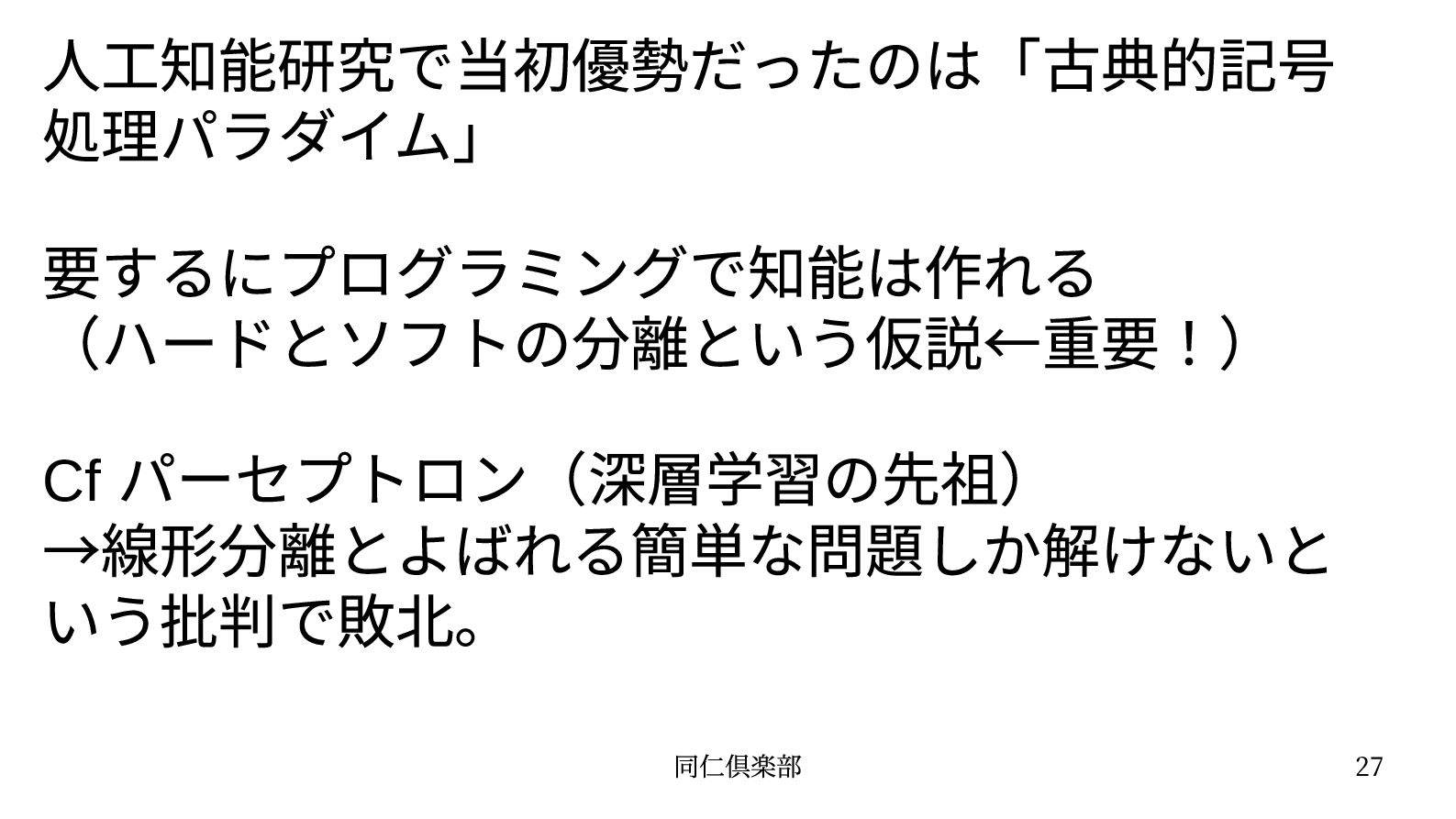 同仁倶楽部 27 人工知能研究で当初優勢だったのは「古典的記号 処理パラダイム」 要するにプログラミングで知能は作れる (ハードとソフトの分離という仮説←重要!) Cf パーセプトロン(深層学習の先祖) →線形分離とよばれる簡単な問題しか解けないと いう批判で敗北。