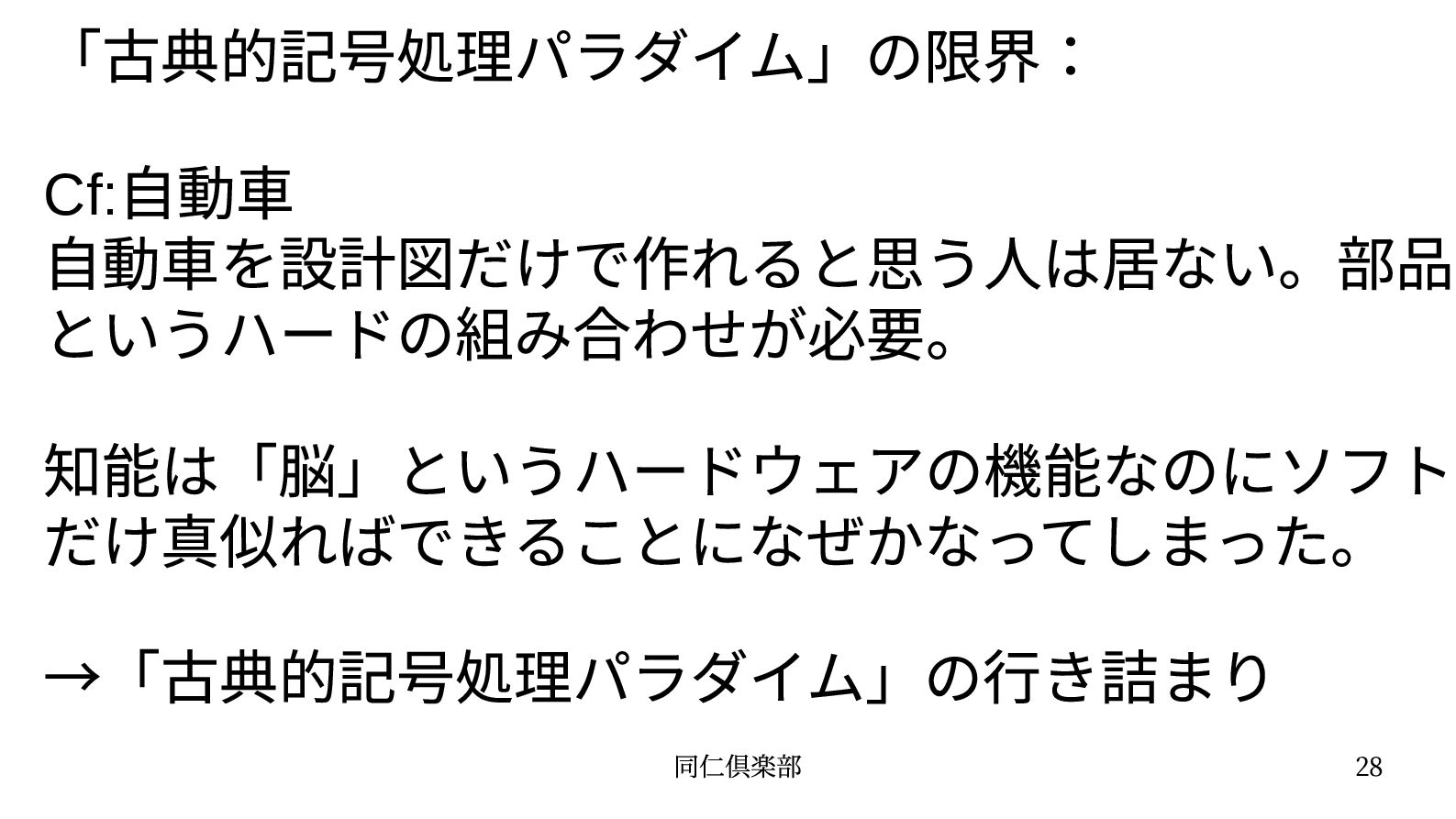 同仁倶楽部 28 「古典的記号処理パラダイム」の限界: Cf: 自動車 自動車を設計図だけで作れると思う人は居ない。部品 というハードの組み合わせが必要。 知能は「脳」というハードウェアの機能なのにソフト だけ真似ればできることになぜかなってしまった。 →「古典的記号処理パラダイム」の行き詰まり