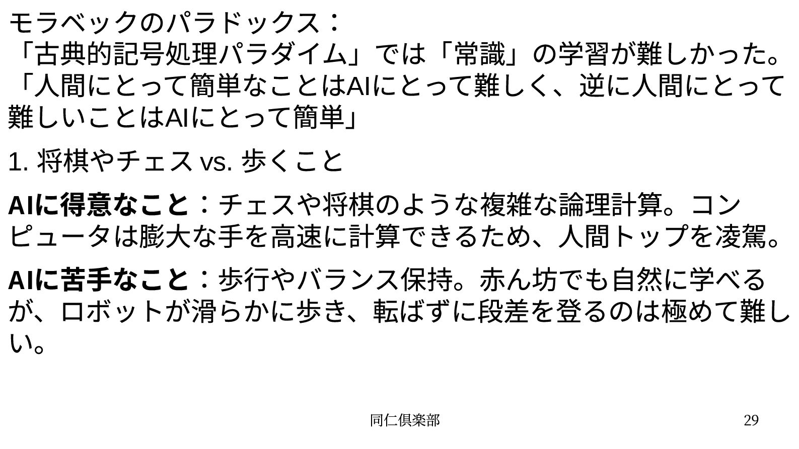 同仁倶楽部 29 モラベックのパラドックス: 「古典的記号処理パラダイム」では「常識」の学習が難しかった。 「人間にとって簡単なことはAI にとって難しく、逆に人間にとって 難しいことはAI にとって簡単」 1. 将棋やチェス