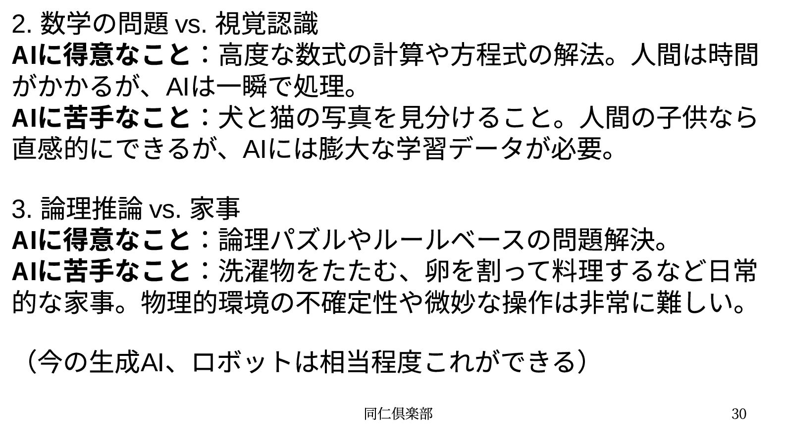 AI に苦手なこと:犬と猫の写真を見分けること。人間の子供なら 直感的にできるが、AI には膨大な学習データが必要。 3. 論理推論 vs. 家事 AI に得意なこと:論理パズルやルールベースの問題解決。 AI に苦手なこと:洗濯物をたたむ、卵を割って料理するなど日常 的な家事。物理的環境の不確定性や微妙な操作は非常に難しい。 (今の生成AI 、ロボットは相当程度これができる)