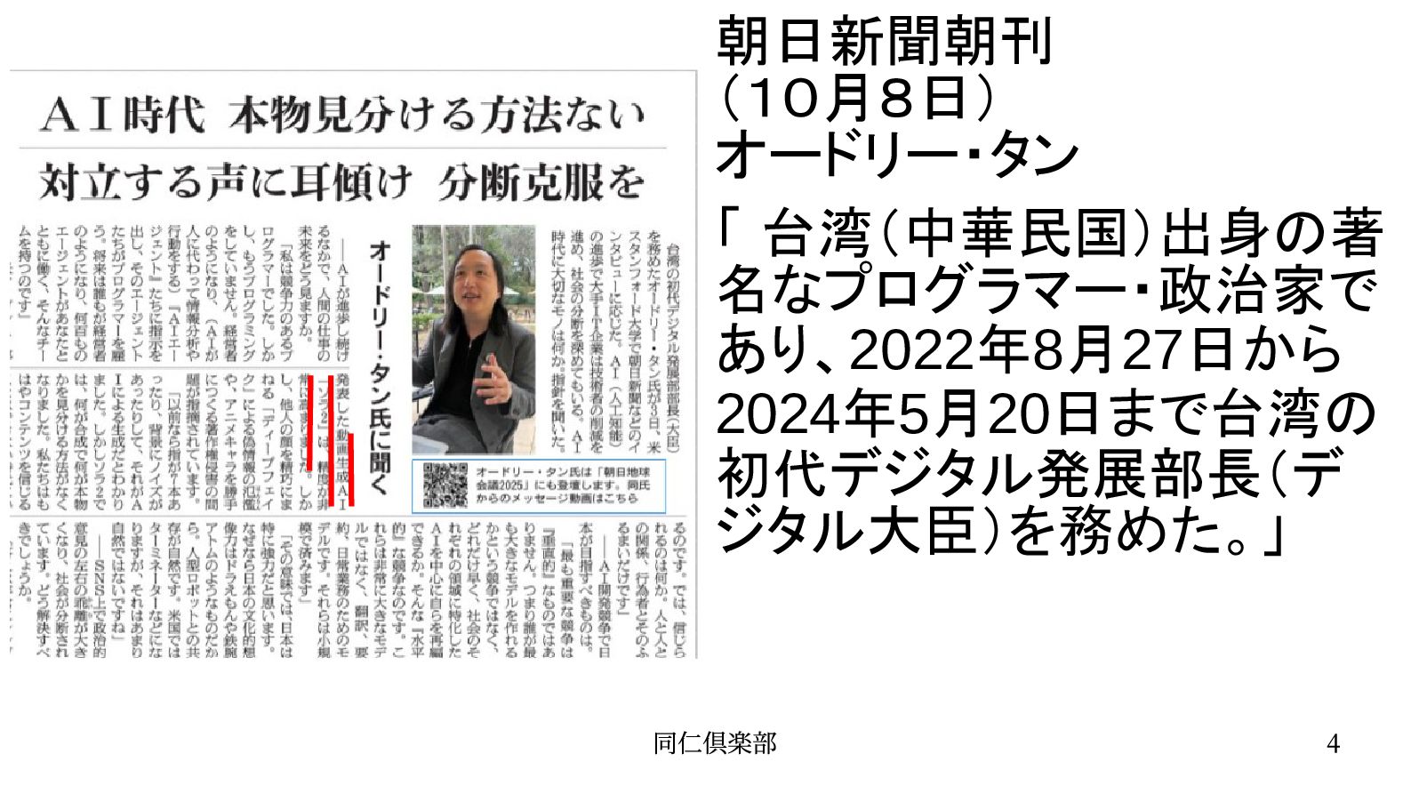同仁倶楽部 4 朝日新聞朝刊 (10月8日) オードリー・タン 「 台湾(中華民国)出身の著 名なプログラマー・政治家で あり、2022年8月27日から 2024年5月20日まで台湾の