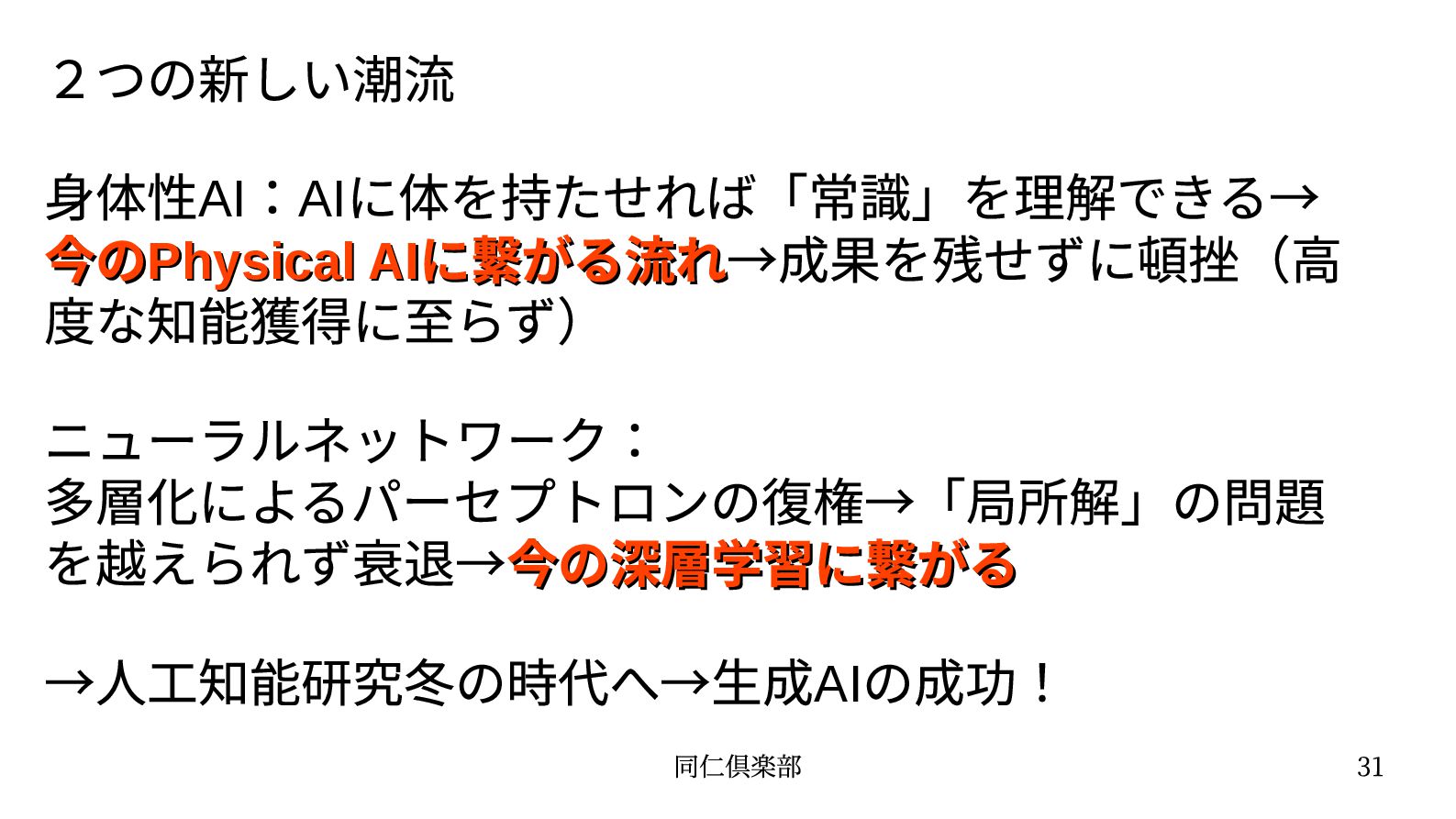 同仁倶楽部 31 2つの新しい潮流 身体性AI :AI に体を持たせれば「常識」を理解できる→ 今の 今のPhysical AI Physical