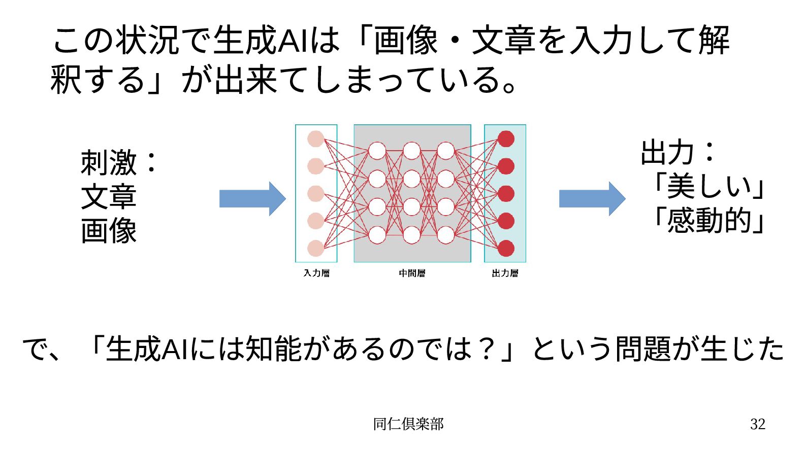 同仁倶楽部 32 この状況で生成AI は「画像・文章を入力して解 釈する」が出来てしまっている。 刺激: 文章 画像 出力: 「美しい」