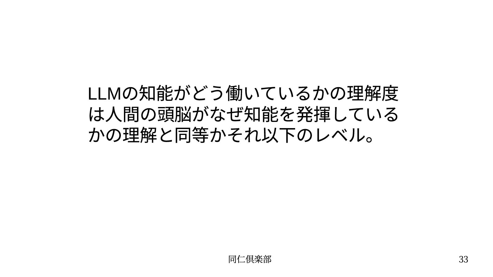 同仁倶楽部 33 LLM の知能がどう働いているかの理解度 は人間の頭脳がなぜ知能を発揮している かの理解と同等かそれ以下のレベル。