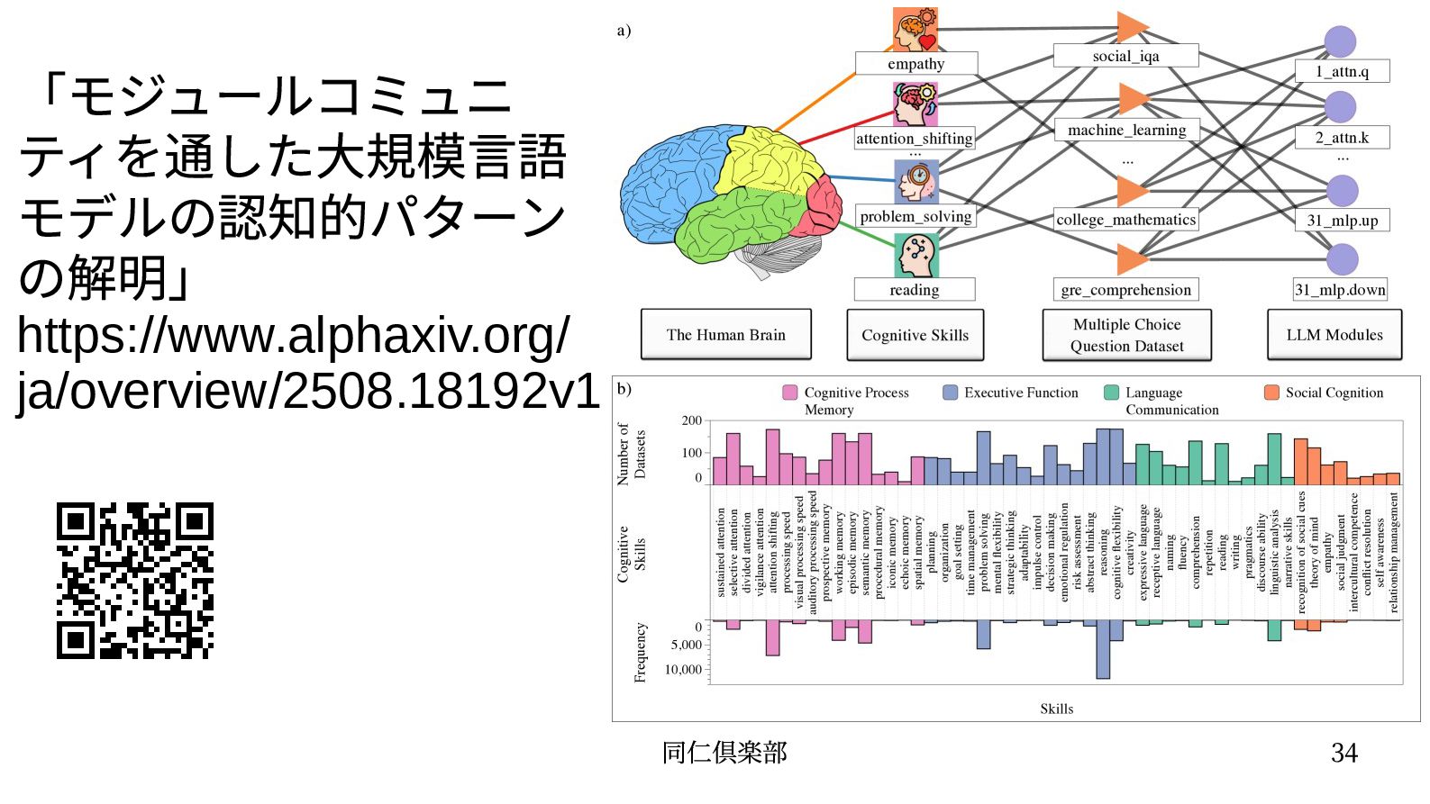 同仁倶楽部 34 「モジュールコミュニ ティを通した大規模言語 モデルの認知的パターン の解明」 https://www.alphaxiv.org/ ja/overview/2508.18192v1