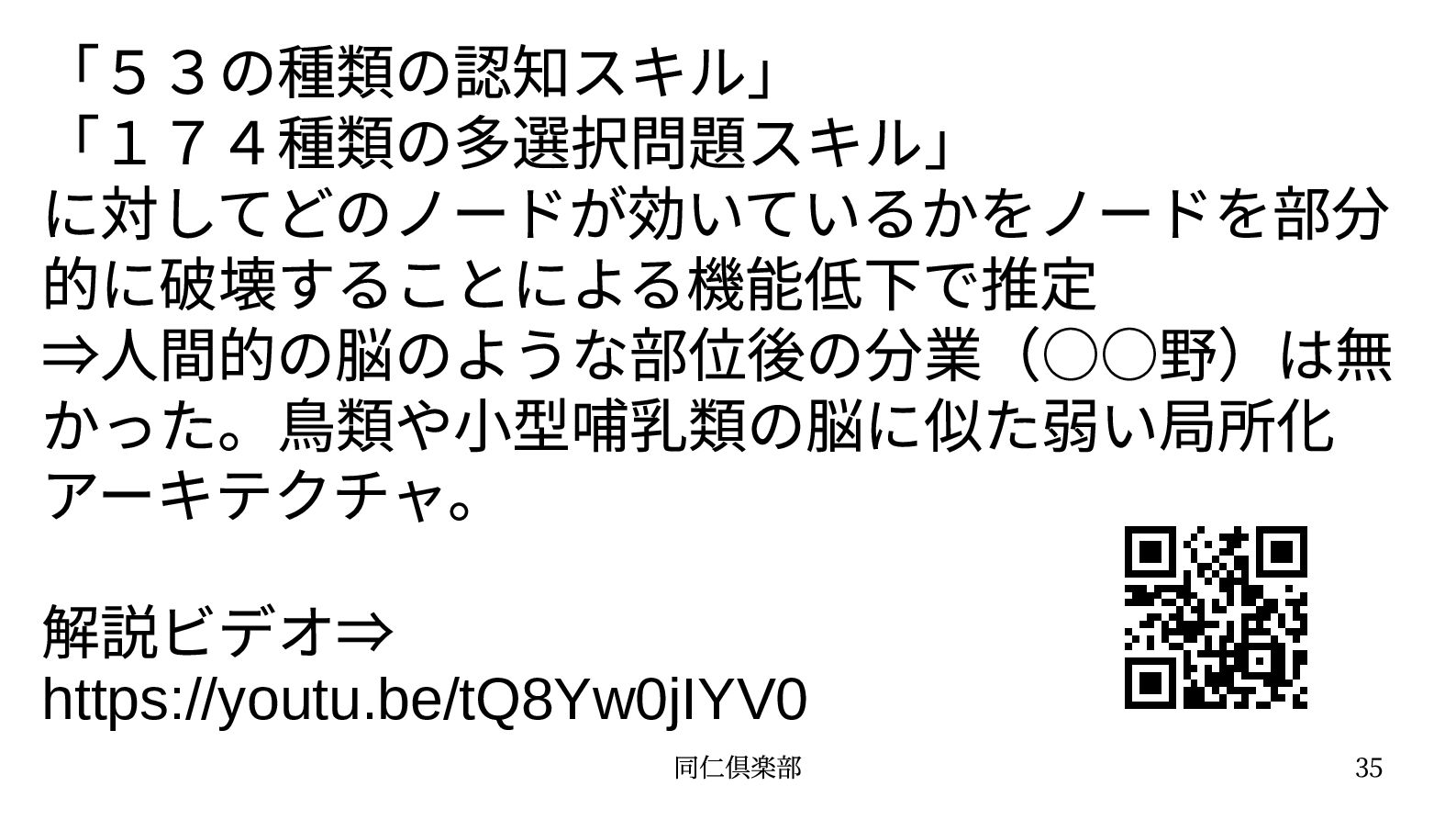 同仁倶楽部 35 「53の種類の認知スキル」 「174種類の多選択問題スキル」 に対してどのノードが効いているかをノードを部分 的に破壊することによる機能低下で推定 ⇒人間的の脳のような部位後の分業(◦◦野)は無 かった。鳥類や小型哺乳類の脳に似た弱い局所化 アーキテクチャ。 解説ビデオ⇒