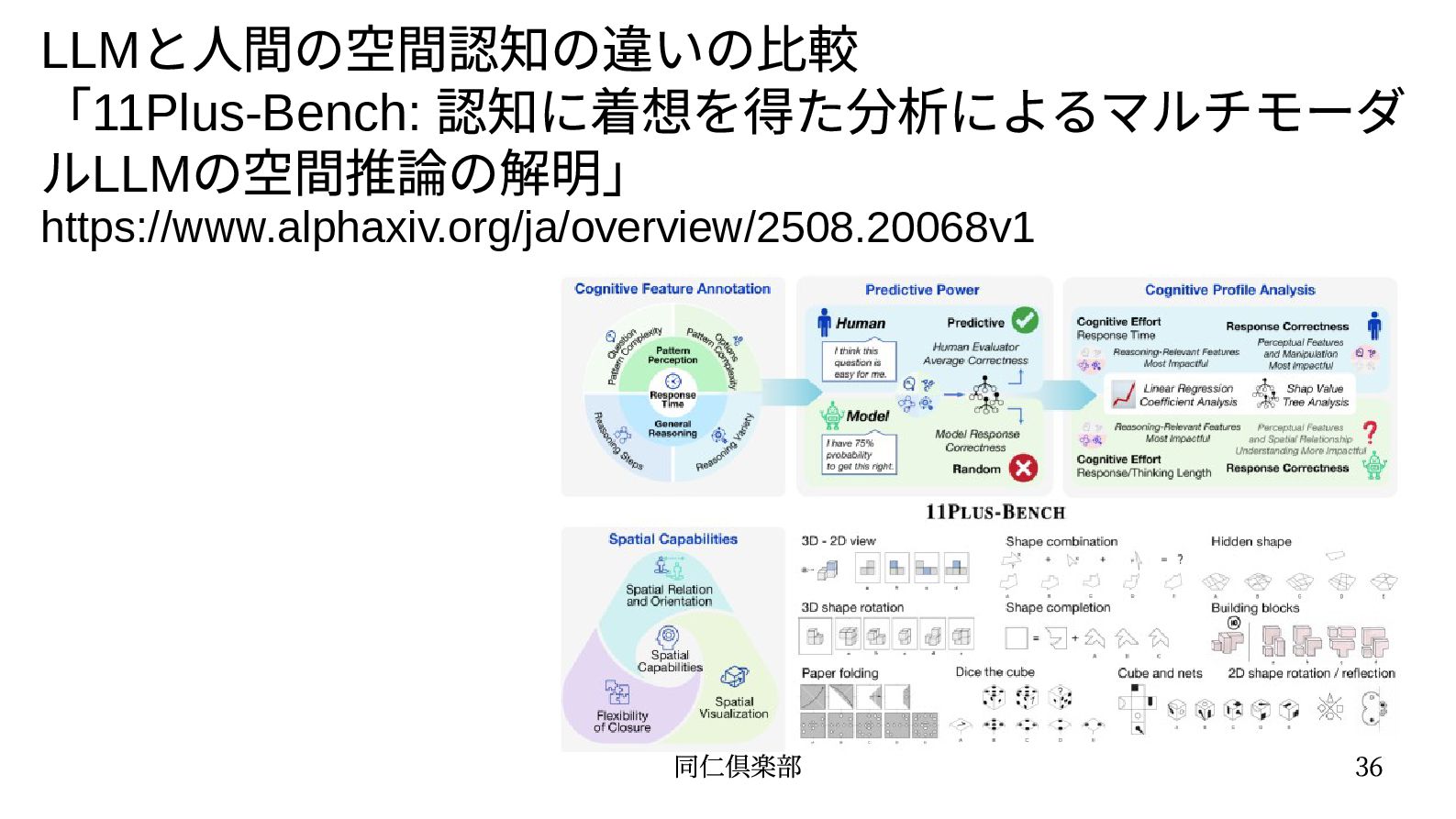 同仁倶楽部 36 LLM と人間の空間認知の違いの比較 「11Plus-Bench: 認知に着想を得た分析によるマルチモーダ ルLLM の空間推論の解明」 https://www.alphaxiv.org/ja/overview/2508.20068v1