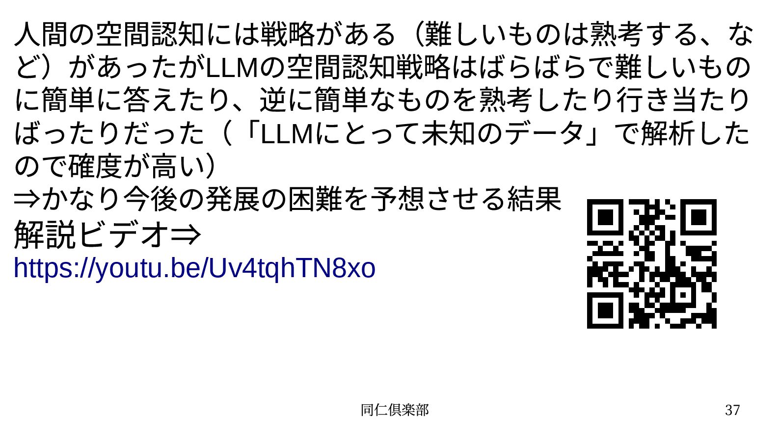 同仁倶楽部 37 人間の空間認知には戦略がある(難しいものは熟考する、な ど)があったがLLM の空間認知戦略はばらばらで難しいもの に簡単に答えたり、逆に簡単なものを熟考したり行き当たり ばったりだった(「LLM にとって未知のデータ」で解析した ので確度が高い) ⇒かなり今後の発展の困難を予想させる結果