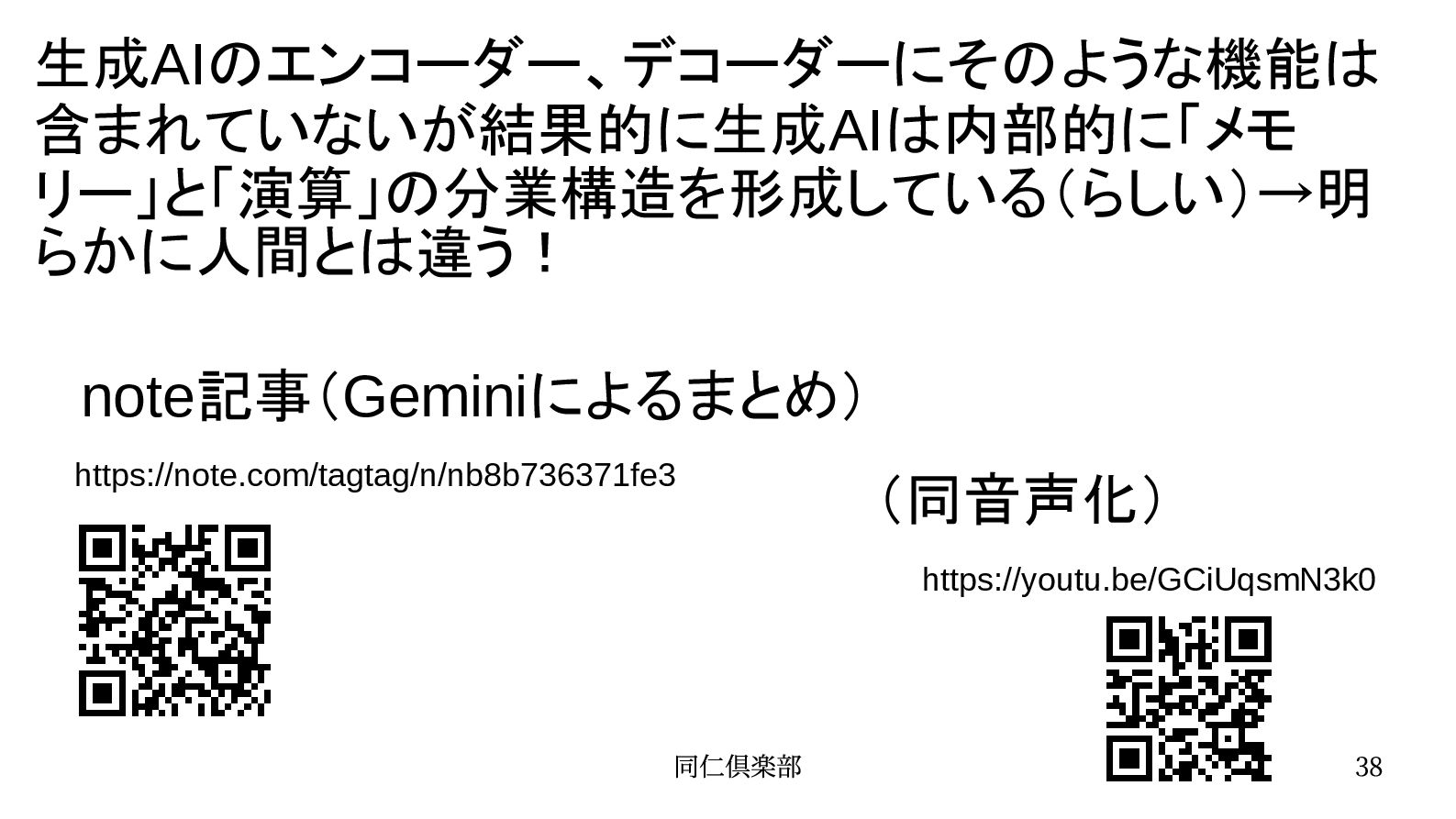 同仁倶楽部 38 生成AIのエンコーダー、デコーダーにそのような機能は 含まれていないが結果的に生成AIは内部的に「メモ リー」と「演算」の分業構造を形成している(らしい)→明 らかに人間とは違う! https://note.com/tagtag/n/nb8b736371fe3 note記事(Geminiによるまとめ) https://youtu.be/GCiUqsmN3k0 (同音声化)