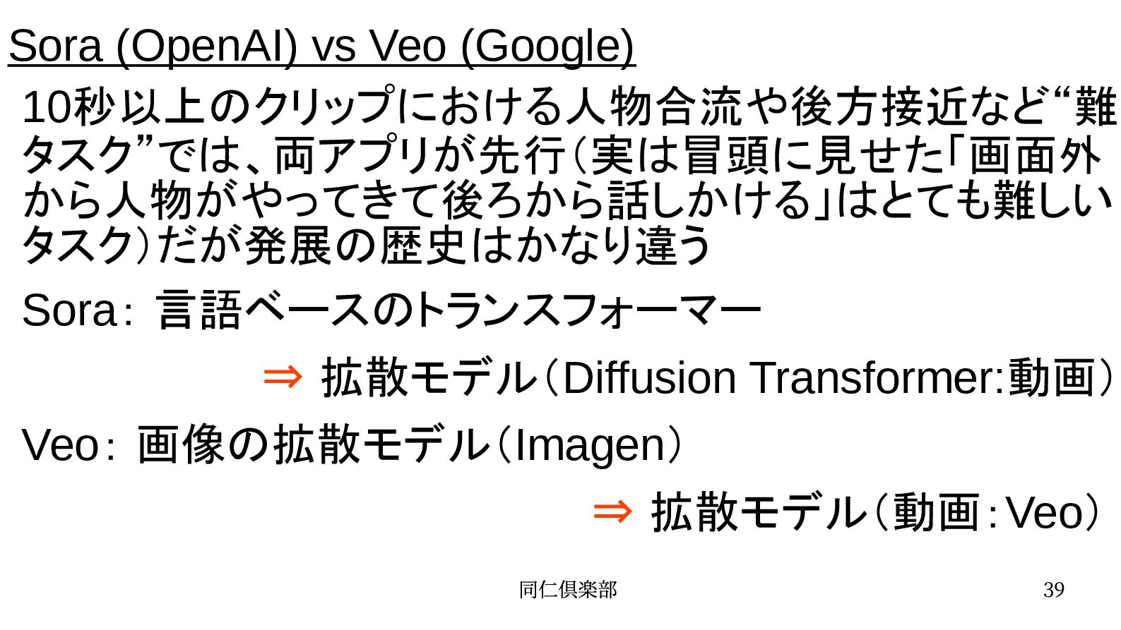 同仁倶楽部 39 Sora (OpenAI) vs Veo (Google) 10秒以上のクリップにおける人物合流や後方接近など“難 タスク”では、両アプリが先行(実は冒頭に見せた「画面外 から人物がやってきて後ろから話しかける」はとても難しい