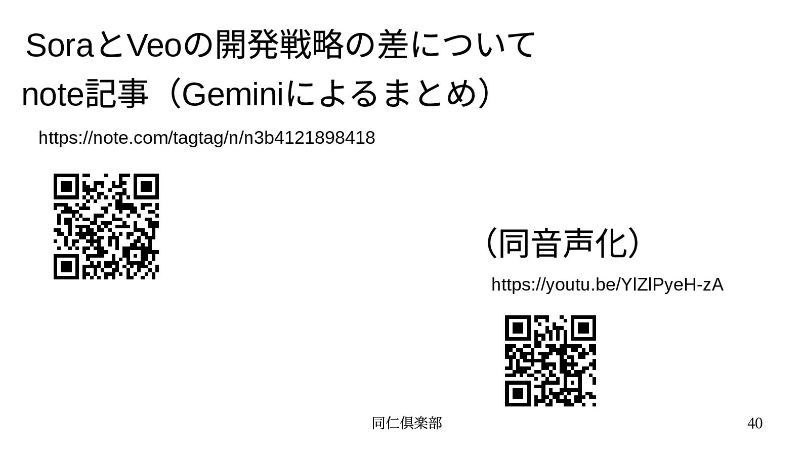 同仁倶楽部 40 note 記事(Gemini によるまとめ) (同音声化) Sora とVeo の開発戦略の差について https://note.com/tagtag/n/n3b4121898418