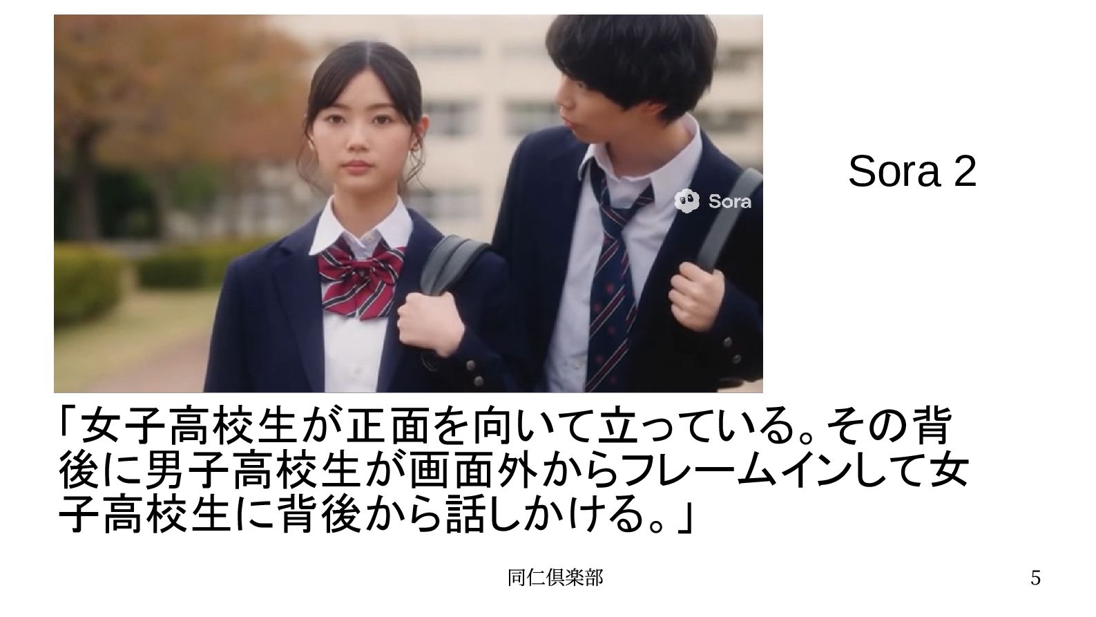 同仁倶楽部 5 「女子高校生が正面を向いて立っている。その背 後に男子高校生が画面外からフレームインして女 子高校生に背後から話しかける。」 Sora 2