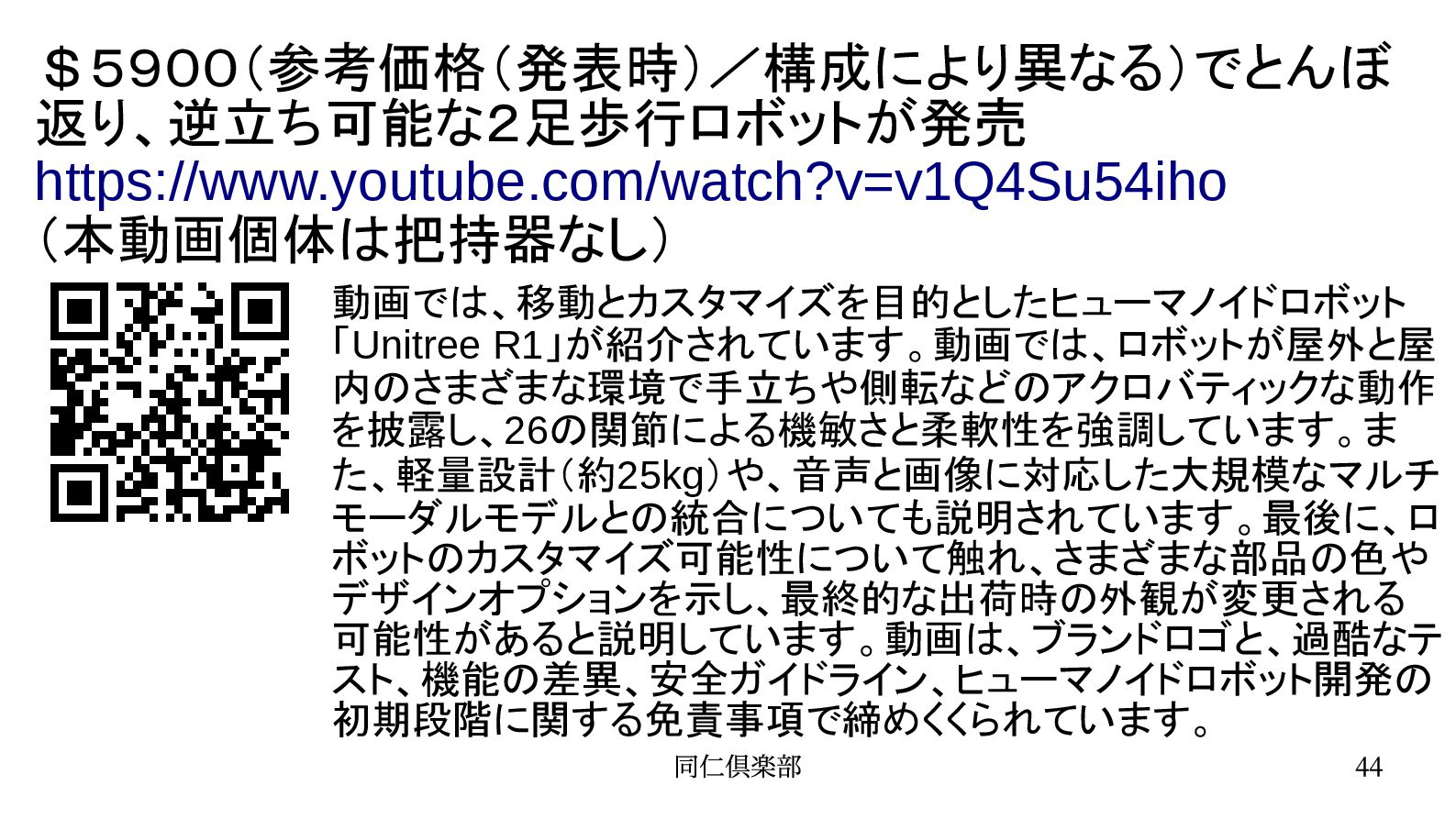同仁倶楽部 44 $5900(参考価格(発表時)/構成により異なる)でとんぼ 返り、逆立ち可能な2足歩行ロボットが発売 https://www.youtube.com/watch?v=v1Q4Su54iho (本動画個体は把持器なし) 動画では、移動とカスタマイズを目的としたヒューマノイドロボット 「Unitree R1」が紹介されています。動画では、ロボットが屋外と屋 内のさまざまな環境で手立ちや側転などのアクロバティックな動作