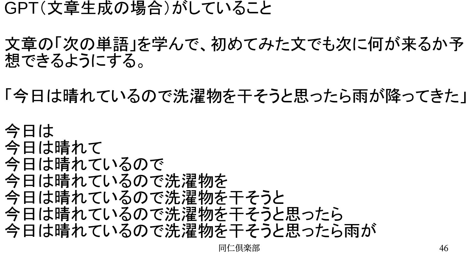 同仁倶楽部 46 GPT(文章生成の場合)がしていること 文章の「次の単語」を学んで、初めてみた文でも次に何が来るか予 想できるようにする。 「今日は晴れているので洗濯物を干そうと思ったら雨が降ってきた」 今日は 今日は晴れて 今日は晴れているので 今日は晴れているので洗濯物を