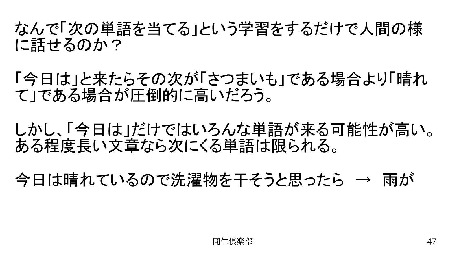 同仁倶楽部 47 なんで「次の単語を当てる」という学習をするだけで人間の様 に話せるのか? 「今日は」と来たらその次が「さつまいも」である場合より「晴れ て」である場合が圧倒的に高いだろう。 しかし、「今日は」だけではいろんな単語が来る可能性が高い。 ある程度長い文章なら次にくる単語は限られる。 今日は晴れているので洗濯物を干そうと思ったら → 雨が