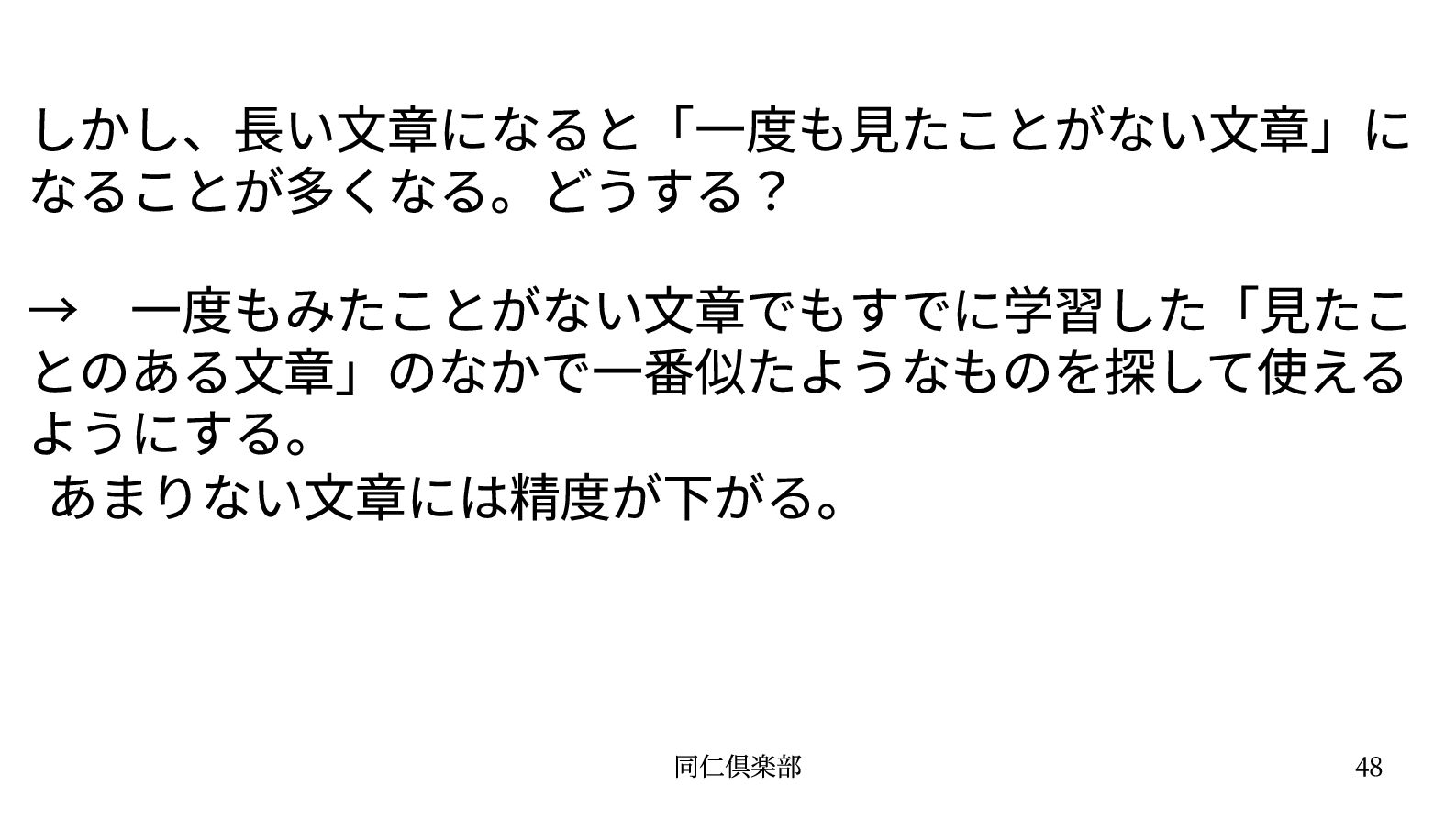 同仁倶楽部 48 しかし、長い文章になると「一度も見たことがない文章」に なることが多くなる。どうする? → 一度もみたことがない文章でもすでに学習した「見たこ とのある文章」のなかで一番似たようなものを探して使える ようにする。 あまりない文章には精度が下がる。