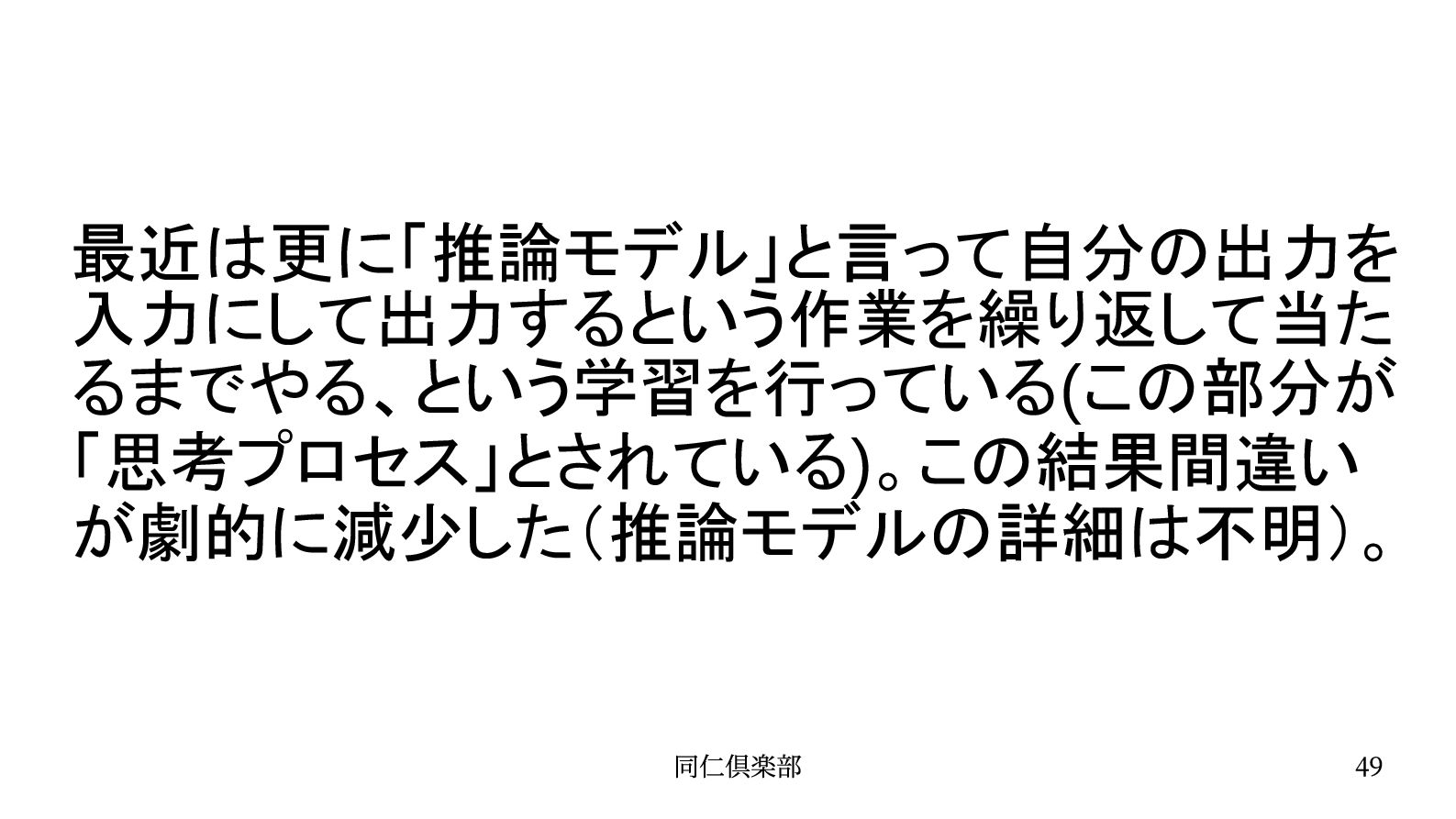 同仁倶楽部 49 最近は更に「推論モデル」と言って自分の出力を 入力にして出力するという作業を繰り返して当た るまでやる、という学習を行っている(この部分が 「思考プロセス」とされている)。この結果間違い が劇的に減少した(推論モデルの詳細は不明)。