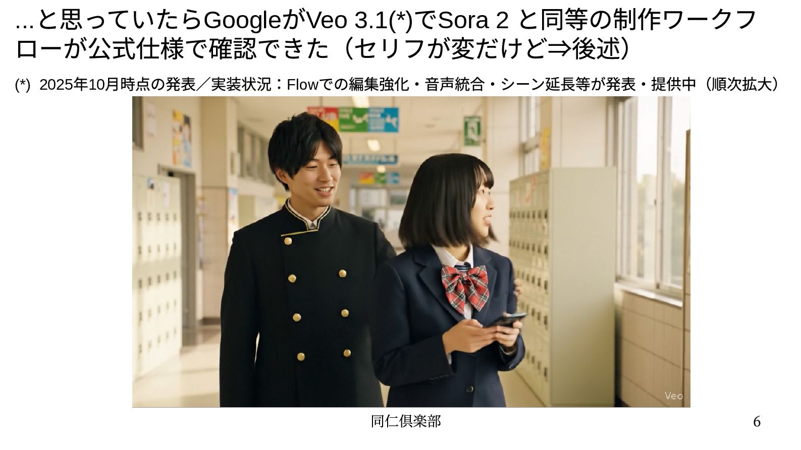 同仁倶楽部 6 ... と思っていたらGoogle がVeo 3.1(*) でSora 2 と同等の制作ワークフ ローが公式仕様で確認できた(セリフが変だけど⇒後述)