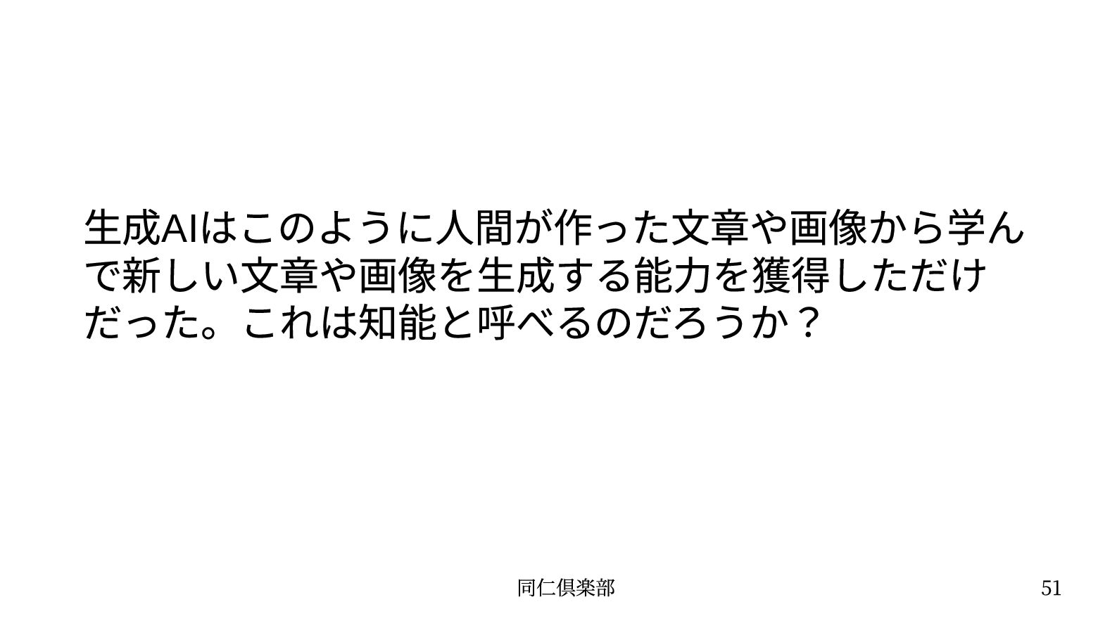 同仁倶楽部 51 生成AI はこのように人間が作った文章や画像から学ん で新しい文章や画像を生成する能力を獲得しただけ だった。これは知能と呼べるのだろうか?