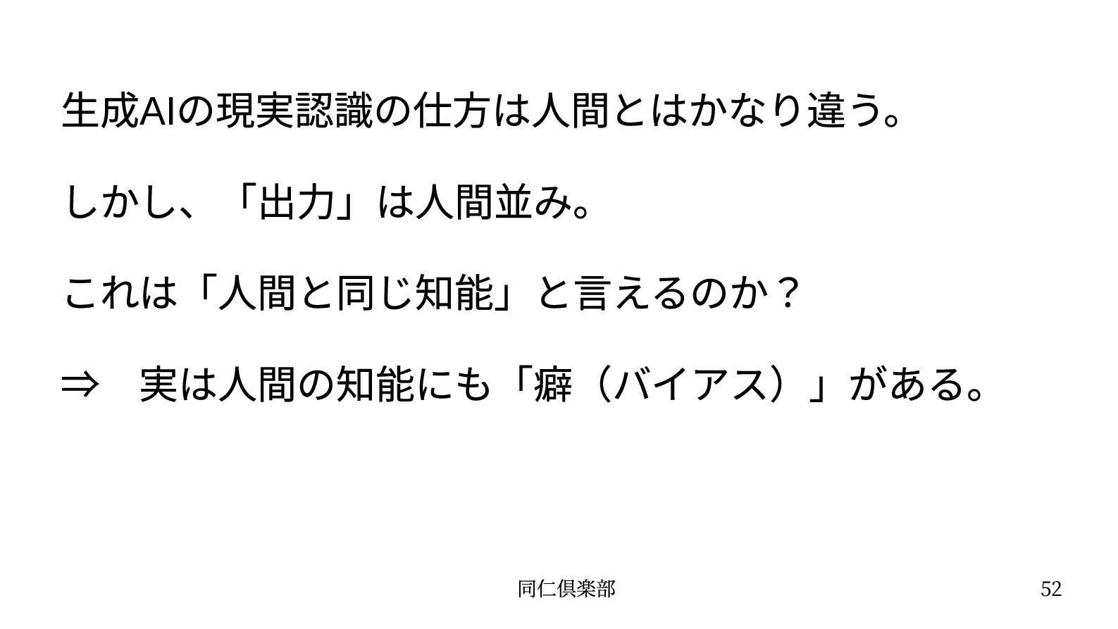 同仁倶楽部 52 生成AI の現実認識の仕方は人間とはかなり違う。 しかし、「出力」は人間並み。 これは「人間と同じ知能」と言えるのか? ⇒ 実は人間の知能にも「癖(バイアス)」がある。
