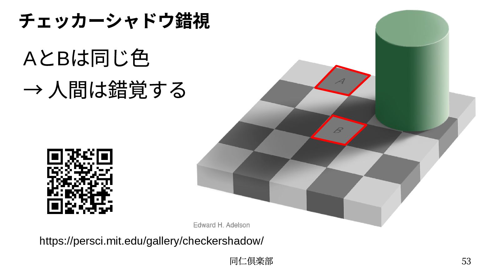 同仁倶楽部 53 チェッカーシャドウ錯視 A とB は同じ色 → 人間は錯覚する https://persci.mit.edu/gallery/checkershadow/