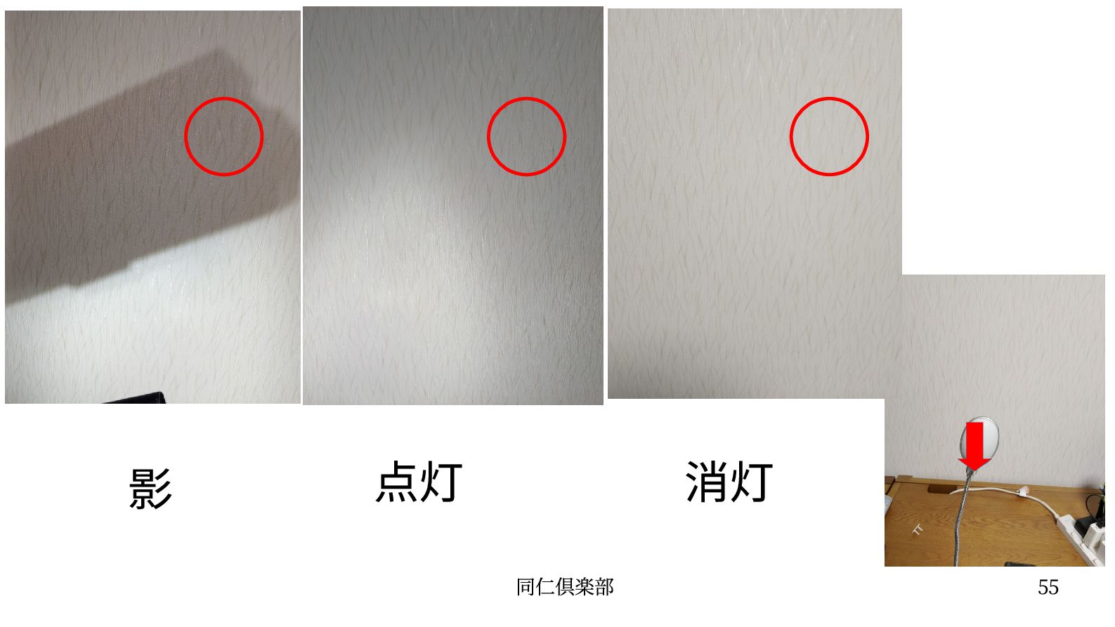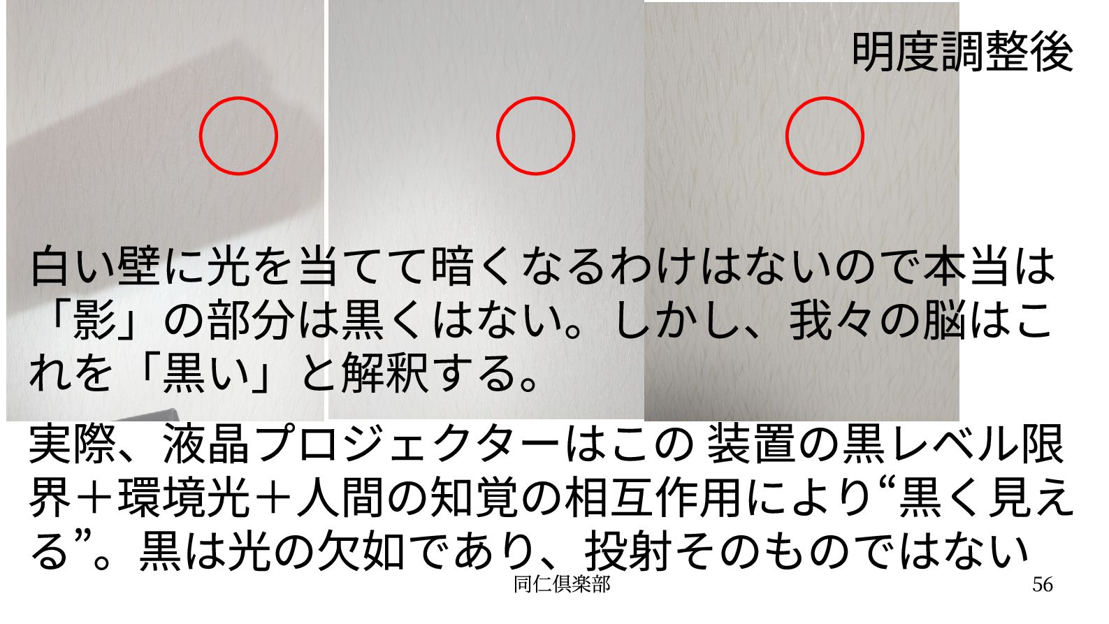 同仁倶楽部 56 白い壁に光を当てて暗くなるわけはないので本当は 「影」の部分は黒くはない。しかし、我々の脳はこ れを「黒い」と解釈する。 実際、液晶プロジェクターはこの 装置の黒レベル限 界+環境光+人間の知覚の相互作用により“黒く見え る”。黒は光の欠如であり、投射そのものではない 明度調整後