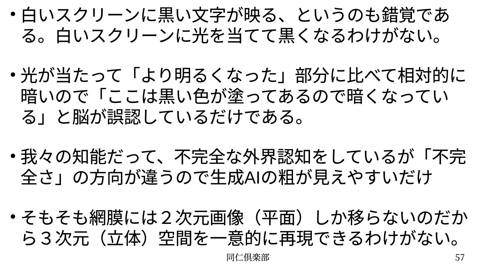 我々の知能だって、不完全な外界認知をしているが「不完 全さ」の方向が違うので生成AI の粗が見えやすいだけ • そもそも網膜には2次元画像(平面)しか移らないのだか ら3次元(立体)空間を一意的に再現できるわけがない。