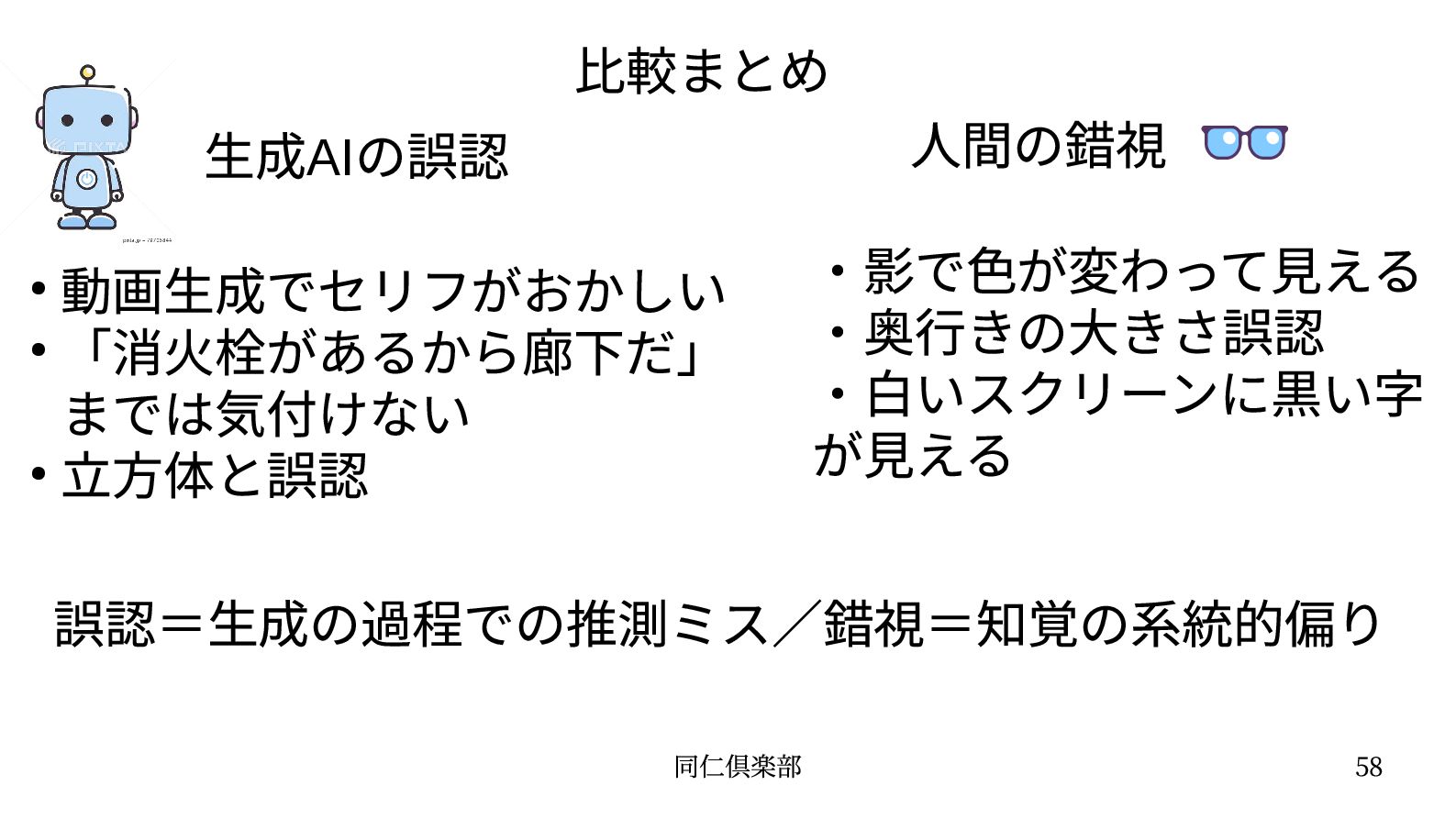 同仁倶楽部 58 生成AI の誤認 人間の錯視 • 動画生成でセリフがおかしい • 「消火栓があるから廊下だ」 までは気付けない