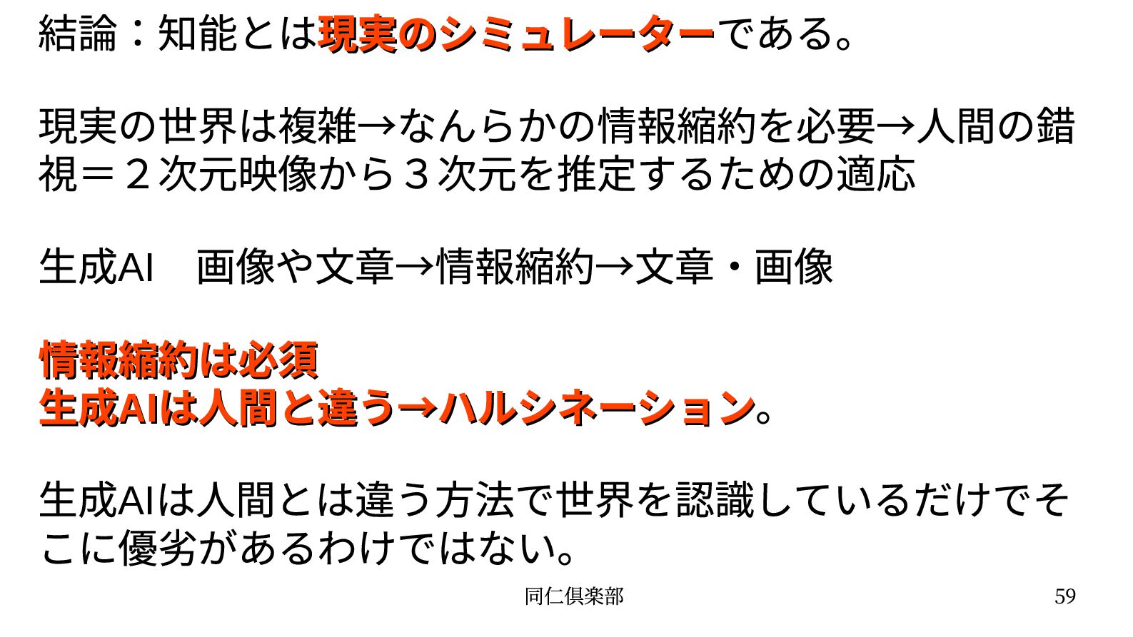 同仁倶楽部 59 結論:知能とは現実のシミュレーター 現実のシミュレーターである。 現実の世界は複雑→なんらかの情報縮約を必要→人間の錯 視=2次元映像から3次元を推定するための適応 生成AI 画像や文章→情報縮約→文章・画像 情報縮約は必須 情報縮約は必須