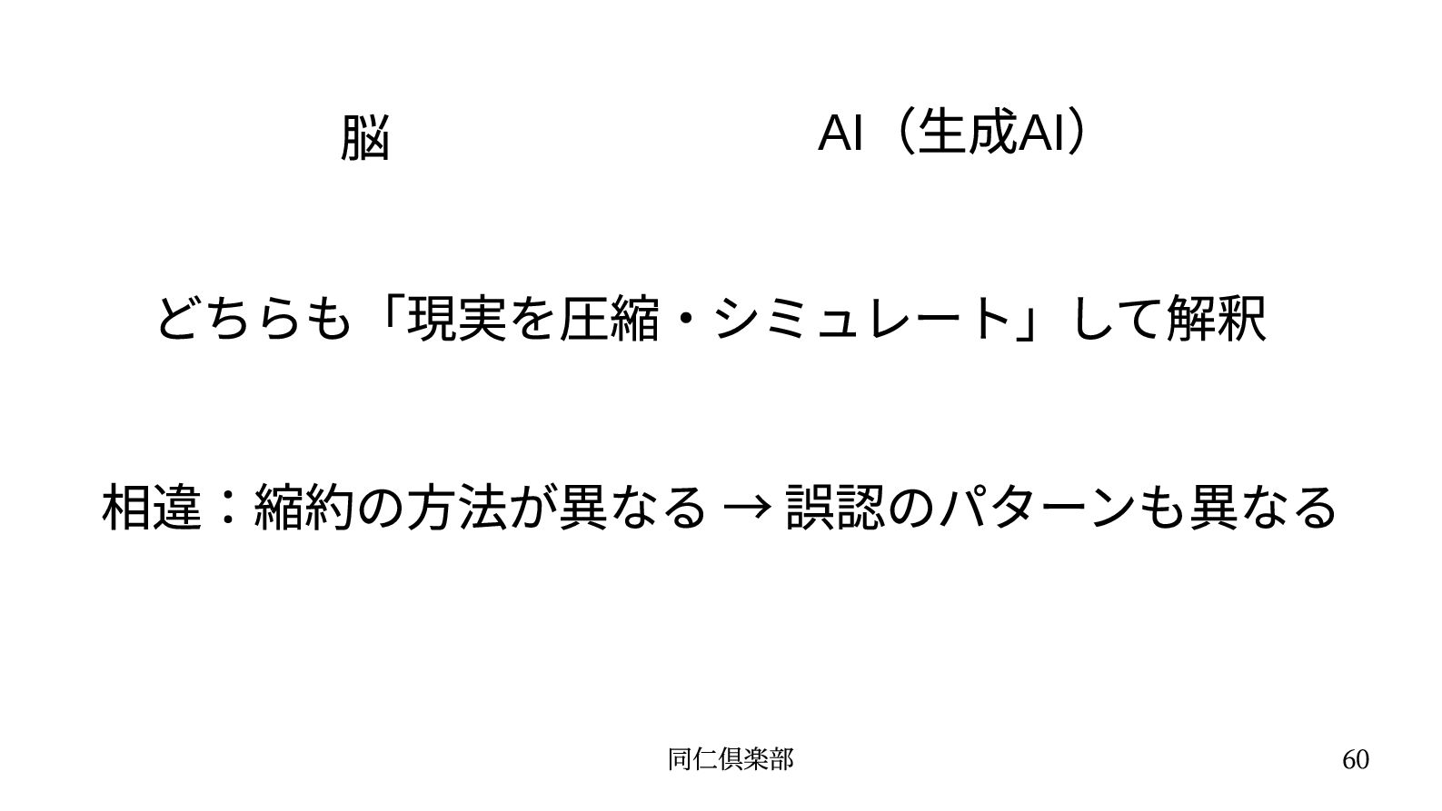 同仁倶楽部 60 脳 AI (生成AI ) どちらも「現実を圧縮・シミュレート」して解釈 相違:縮約の方法が異なる → 誤認のパターンも異なる