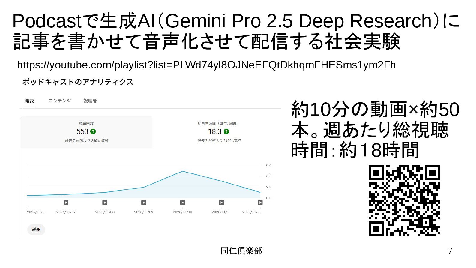 同仁倶楽部 7 Podcastで生成AI(Gemini Pro 2.5 Deep Research)に 記事を書かせて音声化させて配信する社会実験 約10分の動画×約50 本。週あたり総視聴