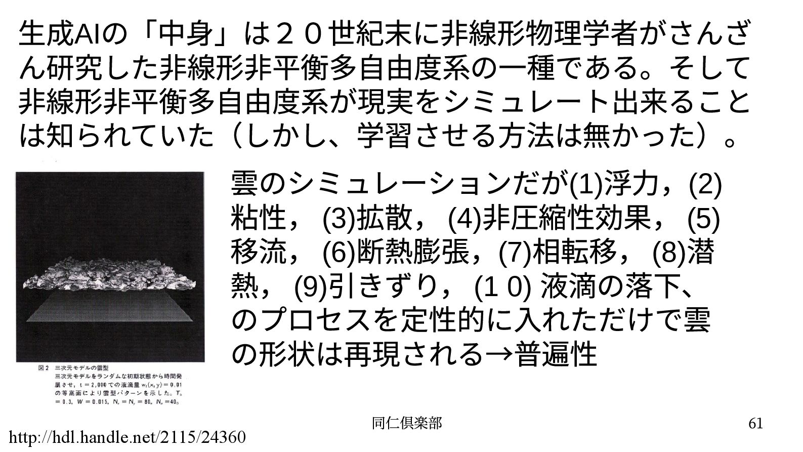 同仁倶楽部 61 生成AI の「中身」は20世紀末に非線形物理学者がさんざ ん研究した非線形非平衡多自由度系の一種である。そして 非線形非平衡多自由度系が現実をシミュレート出来ること は知られていた(しかし、学習させる方法は無かった)。 http://hdl.handle.net/2115/24360 雲のシミュレーションだが(1) 浮力,(2)
