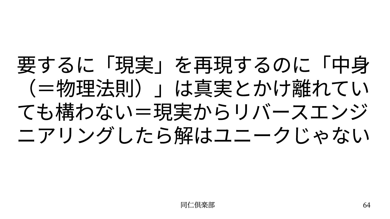 同仁倶楽部 64 要するに「現実」を再現するのに「中身 (=物理法則)」は真実とかけ離れてい ても構わない=現実からリバースエンジ ニアリングしたら解はユニークじゃない