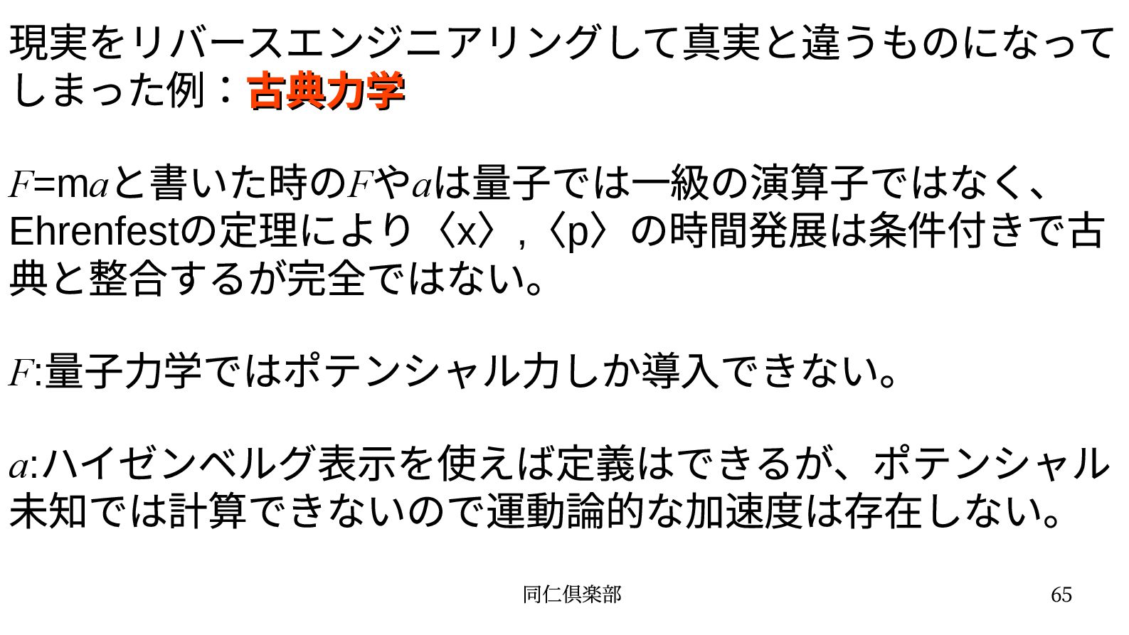 同仁倶楽部 65 現実をリバースエンジニアリングして真実と違うものになって しまった例:古典力学 古典力学 F=ma と書いた時のF やa は量子では一級の演算子ではなく、 Ehrenfest