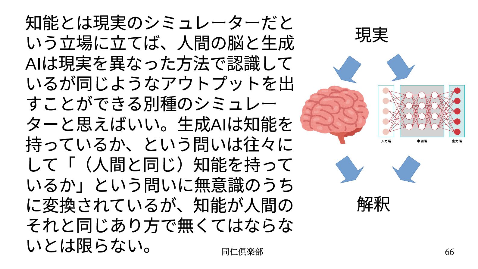 同仁倶楽部 66 知能とは現実のシミュレーターだと いう立場に立てば、人間の脳と生成 AI は現実を異なった方法で認識して いるが同じようなアウトプットを出 すことができる別種のシミュレー ターと思えばいい。生成AI は知能を