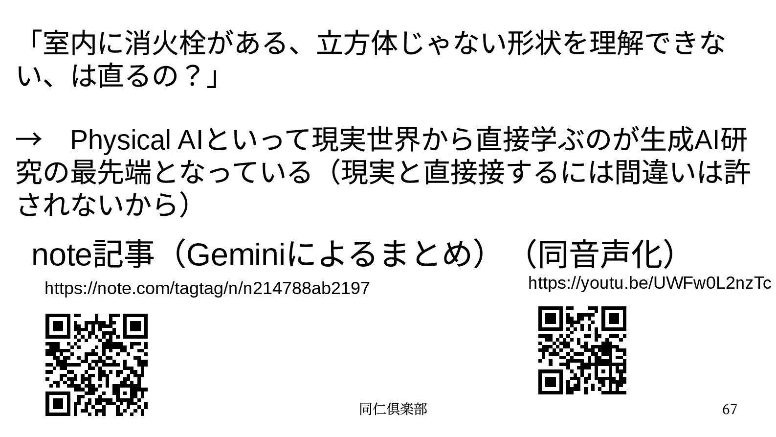 同仁倶楽部 67 「室内に消火栓がある、立方体じゃない形状を理解できな い、は直るの?」 → Physical AI といって現実世界から直接学ぶのが生成AI 研 究の最先端となっている(現実と直接接するには間違いは許 されないから)