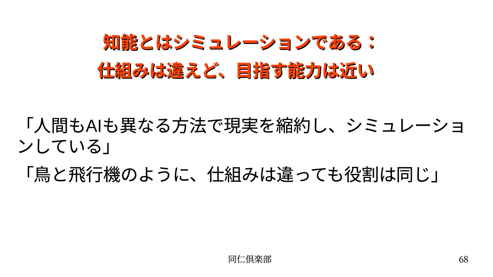 同仁倶楽部 68 知能とはシミュレーションである: 知能とはシミュレーションである: 仕組みは違えど、目指す能力は近い 仕組みは違えど、目指す能力は近い 「人間もAI も異なる方法で現実を縮約し、シミュレーショ ンしている」 「鳥と飛行機のように、仕組みは違っても役割は同じ」