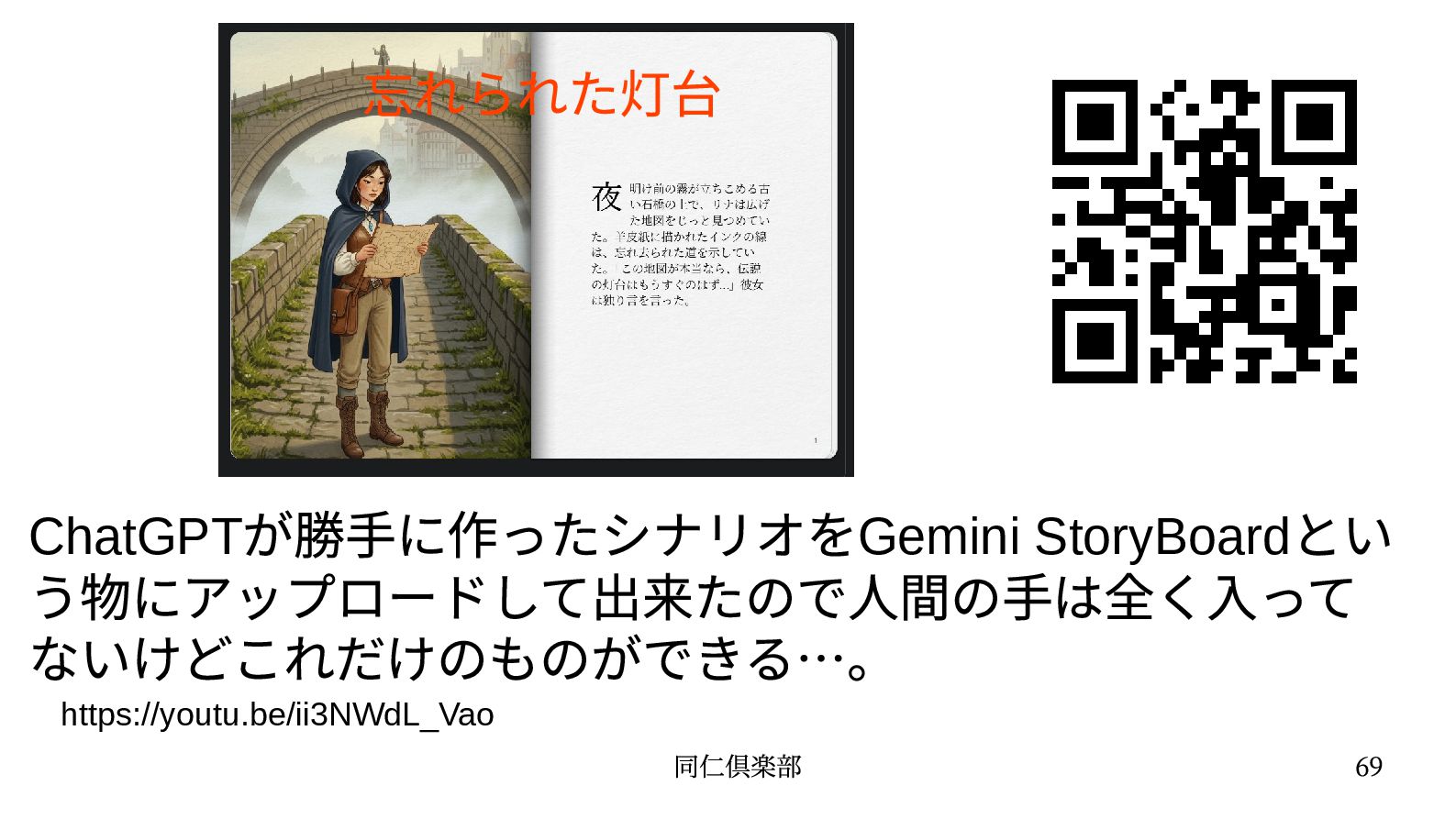 同仁倶楽部 69 https://youtu.be/ii3NWdL_Vao ChatGPT が勝手に作ったシナリオをGemini StoryBoard とい う物にアップロードして出来たので人間の手は全く入って ないけどこれだけのものができる…。 忘れられた灯台