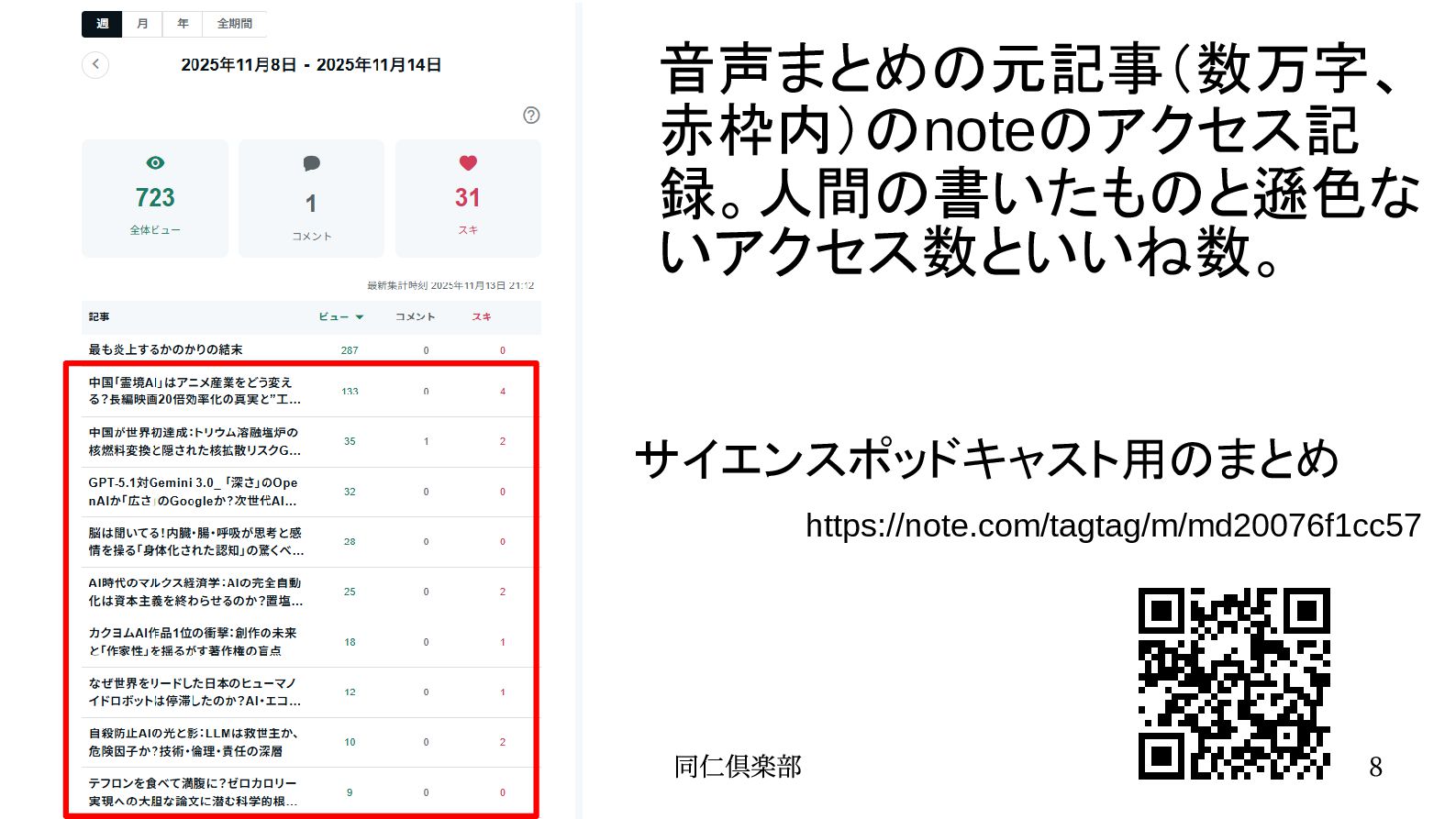 同仁倶楽部 8 音声まとめの元記事(数万字、 赤枠内)のnoteのアクセス記 録。人間の書いたものと遜色な いアクセス数といいね数。 https://note.com/tagtag/m/md20076f1cc57 サイエンスポッドキャスト用のまとめ
