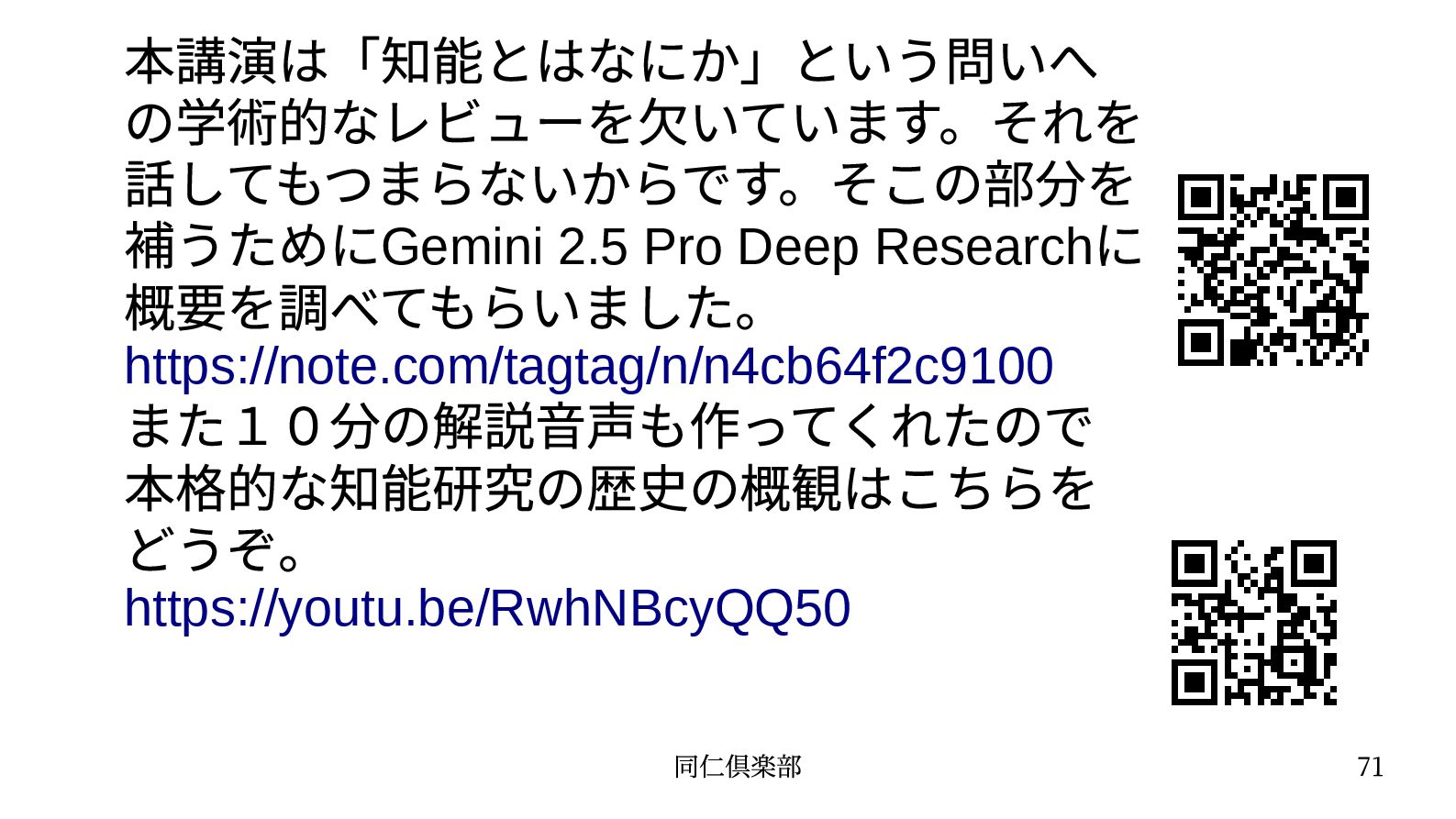 同仁倶楽部 71 本講演は「知能とはなにか」という問いへ の学術的なレビューを欠いています。それを 話してもつまらないからです。そこの部分を 補うためにGemini 2.5 Pro Deep Research