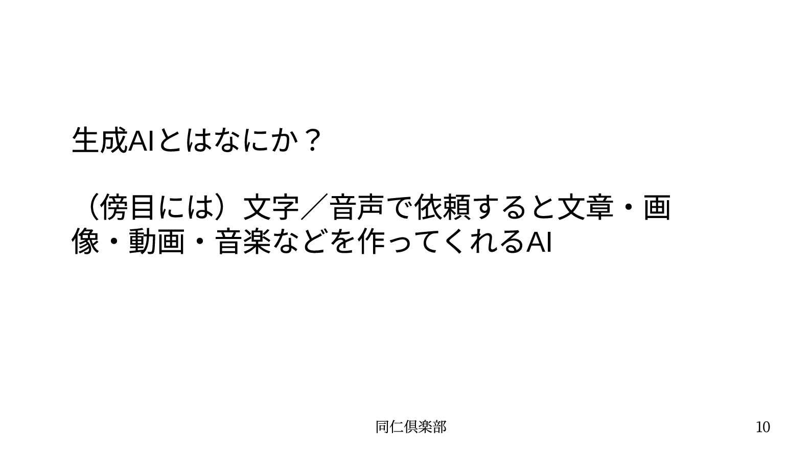 同仁倶楽部 10 生成AI とはなにか? (傍目には)文字/音声で依頼すると文章・画 像・動画・音楽などを作ってくれるAI