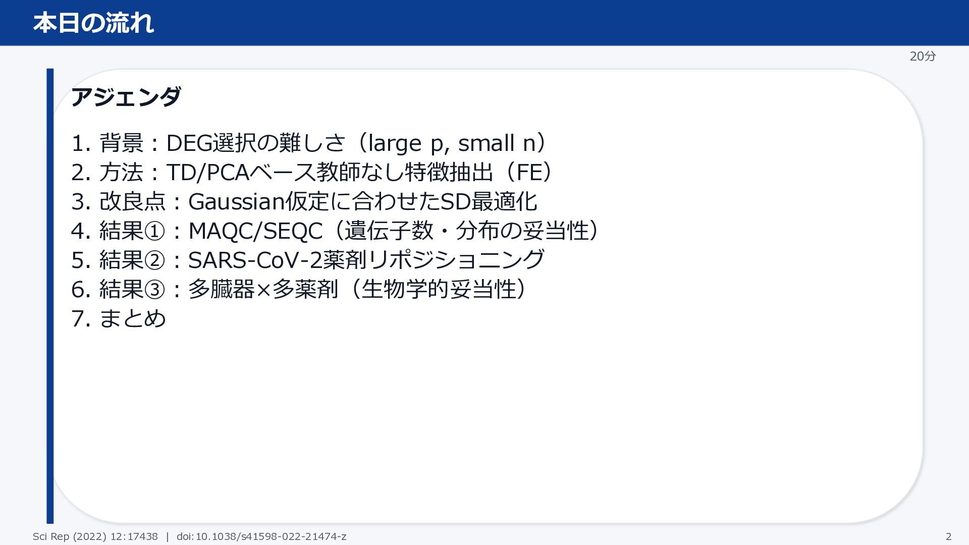 3. 改良点:Gaussian仮定に合わせたSD最適化 4. 結果①:MAQC/SEQC(遺伝子数・分布の妥当性) 5. 結果②:SARS-CoV-2薬剤リポジショニング 6. 結果③:多臓器×多薬剤(生物学的妥当性) 7. まとめ Sci Rep (2022) 12:17438 | doi:10.1038/s41598-022-21474-z 2