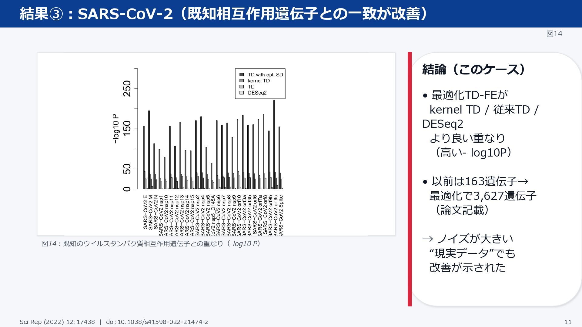 従来TD / DESeq2 より良い重なり (高い- log10P) • 以前は163遺伝子→ 最適化で3,627遺伝子 (論文記載) → ノイズが大きい “現実データ”でも 改善が示された Sci Rep (2022) 12:17438 | doi:10.1038/s41598-022-21474-z 11