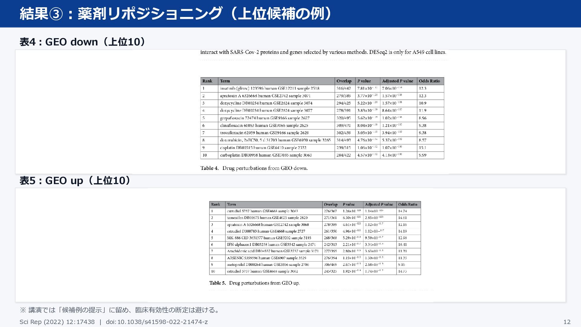 結果③:薬剤リポジショニング(上位候補の例) 表4:GEO down(上位10) 表5:GEO up(上位10) ※ 講演では「候補例の提示」に留め、臨床有効性の断定は避ける。 Sci Rep (2022)