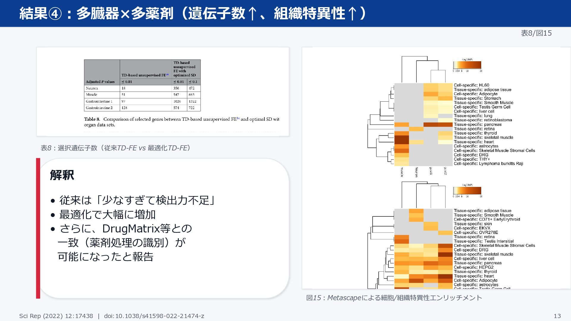 結果④:多臓器×多薬剤(遺伝子数↑、組織特異性↑) 表8/図15 表8:選択遺伝子数(従来TD-FE vs 最適化TD-FE) 解釈 • 従来は「少なすぎて検出力不足」 • 最適化で大幅に増加