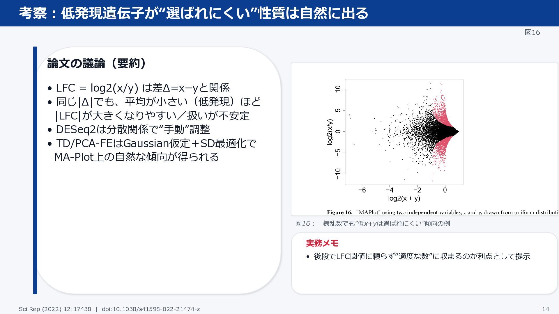 |LFC|が大きくなりやすい/扱いが不安定 • DESeq2は分散関係で“手動”調整 • TD/PCA-FEはGaussian仮定+SD最適化で MA-Plot上の自然な傾向が得られる 図16:一様乱数でも“低x+yは選ばれにくい”傾向の例 実務メモ • 後段でLFC閾値に頼らず“適度な数”に収まるのが利点として提示 Sci Rep (2022) 12:17438 | doi:10.1038/s41598-022-21474-z 14