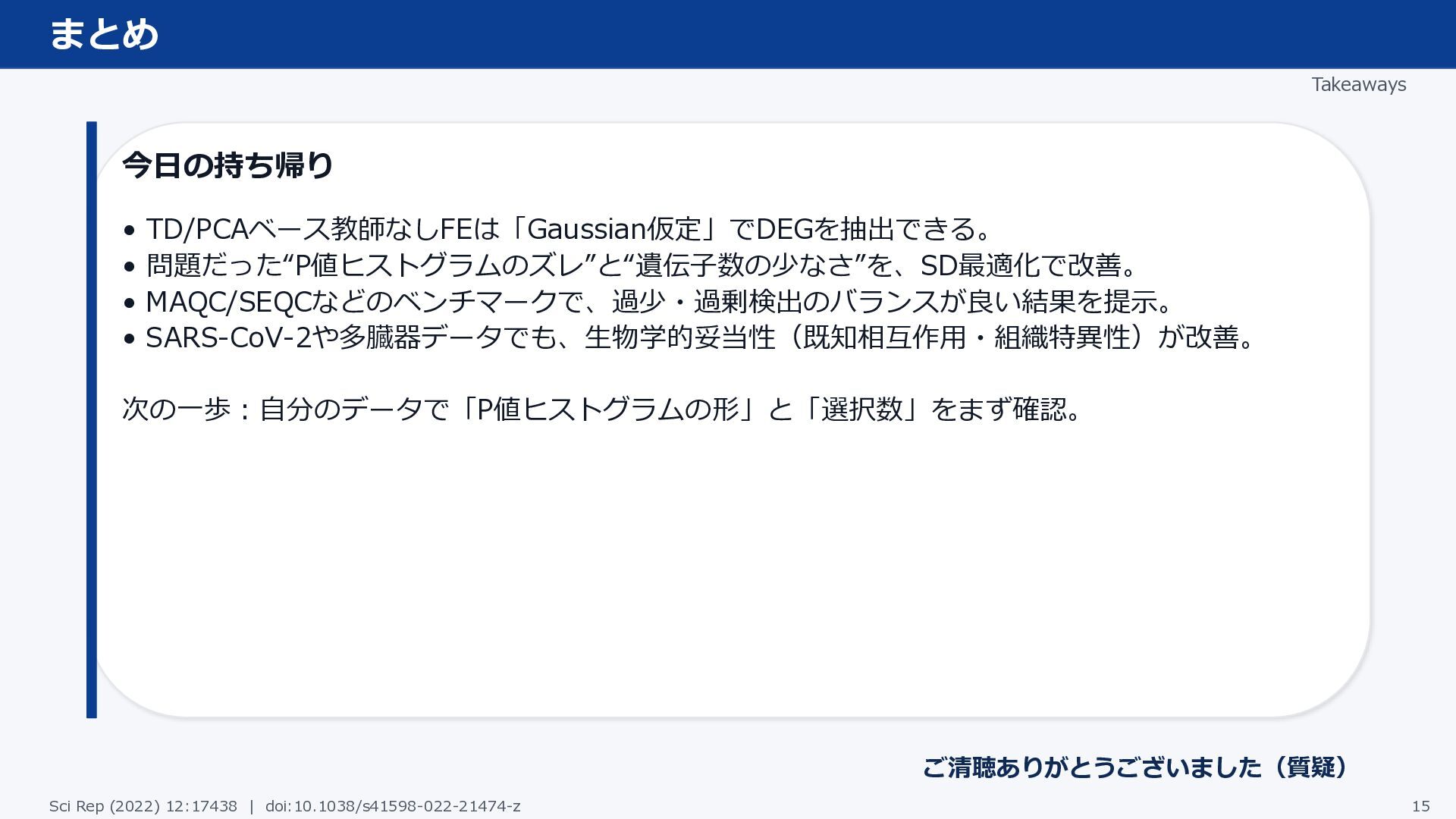 SARS-CoV-2や多臓器データでも、生物学的妥当性(既知相互作用・組織特異性)が改善。 次の一歩:自分のデータで「P値ヒストグラムの形」と「選択数」をまず確認。 ご清聴ありがとうございました(質疑) Sci Rep (2022) 12:17438 | doi:10.1038/s41598-022-21474-z 15