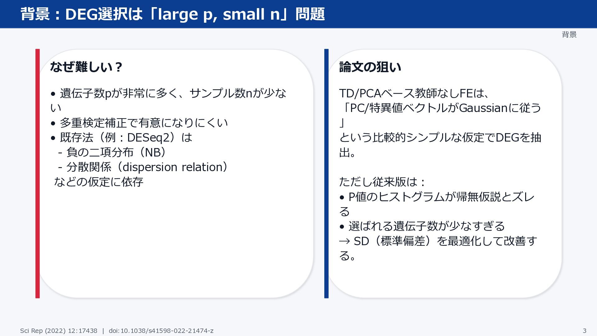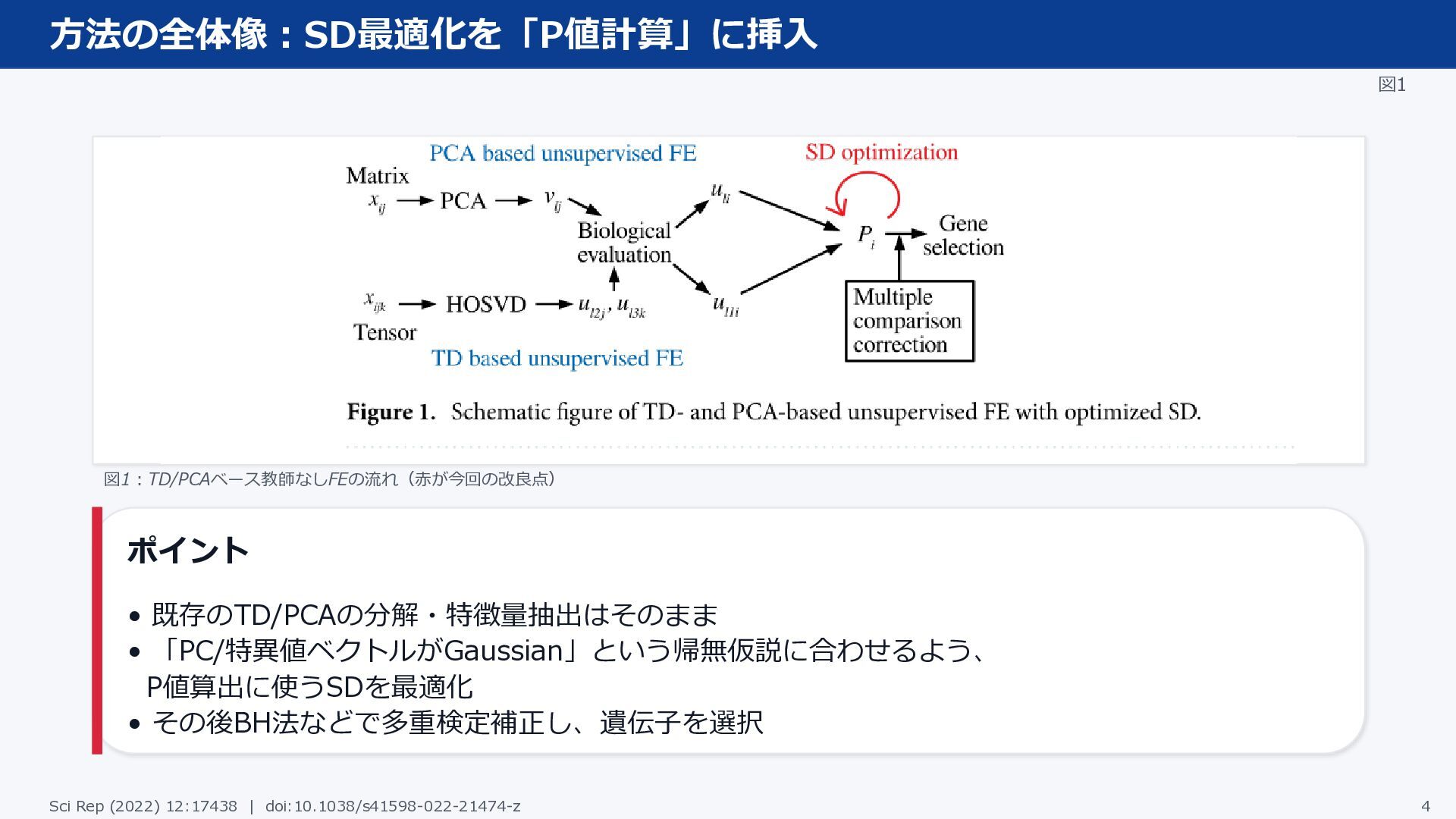 多重検定補正で有意になりにくい • 既存法(例:DESeq2)は - 負の二項分布(NB) - 分散関係(dispersion relation) などの仮定に依存 論文の狙い TD/PCAベース教師なしFEは、 「PC/特異値ベクトルがGaussianに従う 」 という比較的シンプルな仮定でDEGを抽 出。 ただし従来版は: • P値のヒストグラムが帰無仮説とズレ る • 選ばれる遺伝子数が少なすぎる → SD(標準偏差)を最適化して改善す る。 Sci Rep (2022) 12:17438 | doi:10.1038/s41598-022-21474-z 3
