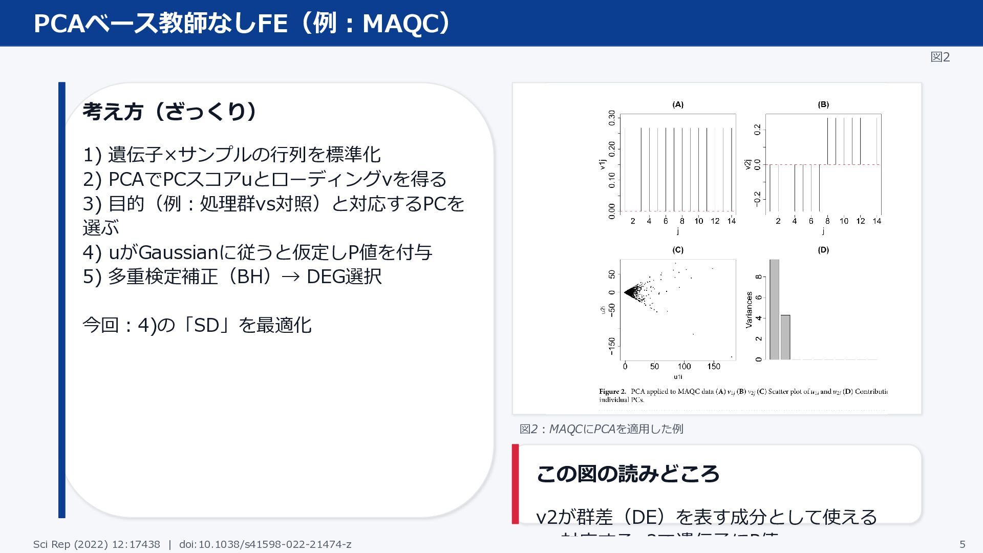 4) uがGaussianに従うと仮定しP値を付与 5) 多重検定補正(BH)→ DEG選択 今回:4)の「SD」を最適化 図2:MAQCにPCAを適用した例 この図の読みどころ v2が群差(DE)を表す成分として使える → 対応するu2で遺伝子にP値 Sci Rep (2022) 12:17438 | doi:10.1038/s41598-022-21474-z 5