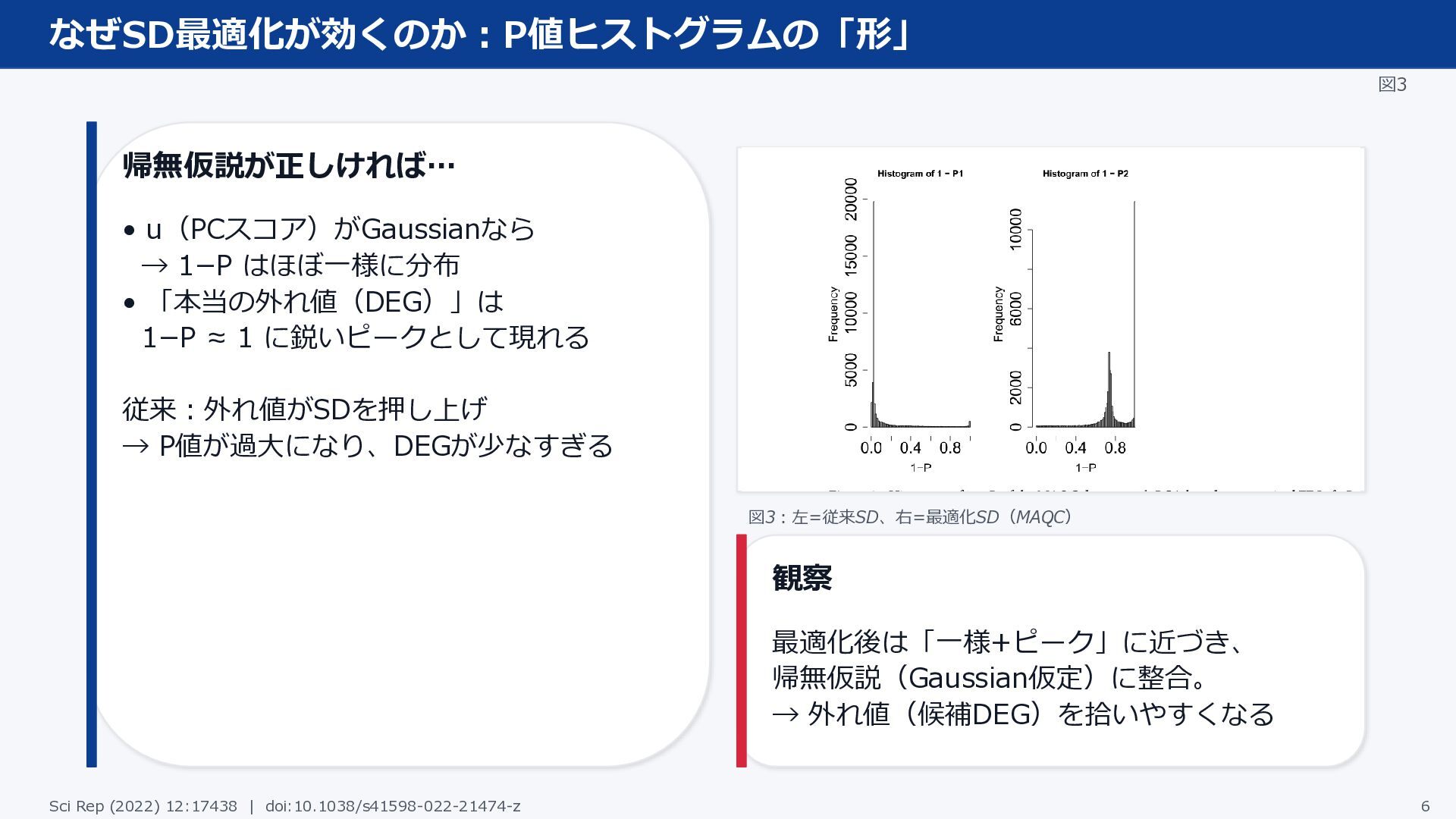 1−P ≈ 1 に鋭いピークとして現れる 従来:外れ値がSDを押し上げ → P値が過大になり、DEGが少なすぎる 図3:左=従来SD、右=最適化SD(MAQC) 観察 最適化後は「一様+ピーク」に近づき、 帰無仮説(Gaussian仮定)に整合。 → 外れ値(候補DEG)を拾いやすくなる Sci Rep (2022) 12:17438 | doi:10.1038/s41598-022-21474-z 6